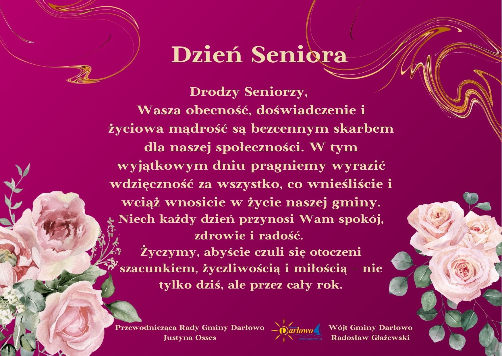 Wasza obecność, doświadczenie i życiowa mądrość są bezcennym skarbem dla naszej społeczności. W tym wyjątkowym dniu pragniemy wyrazić wdzięczność za wszystko, co wnieśliście i wciąż wnosicie w życie naszej gminy.