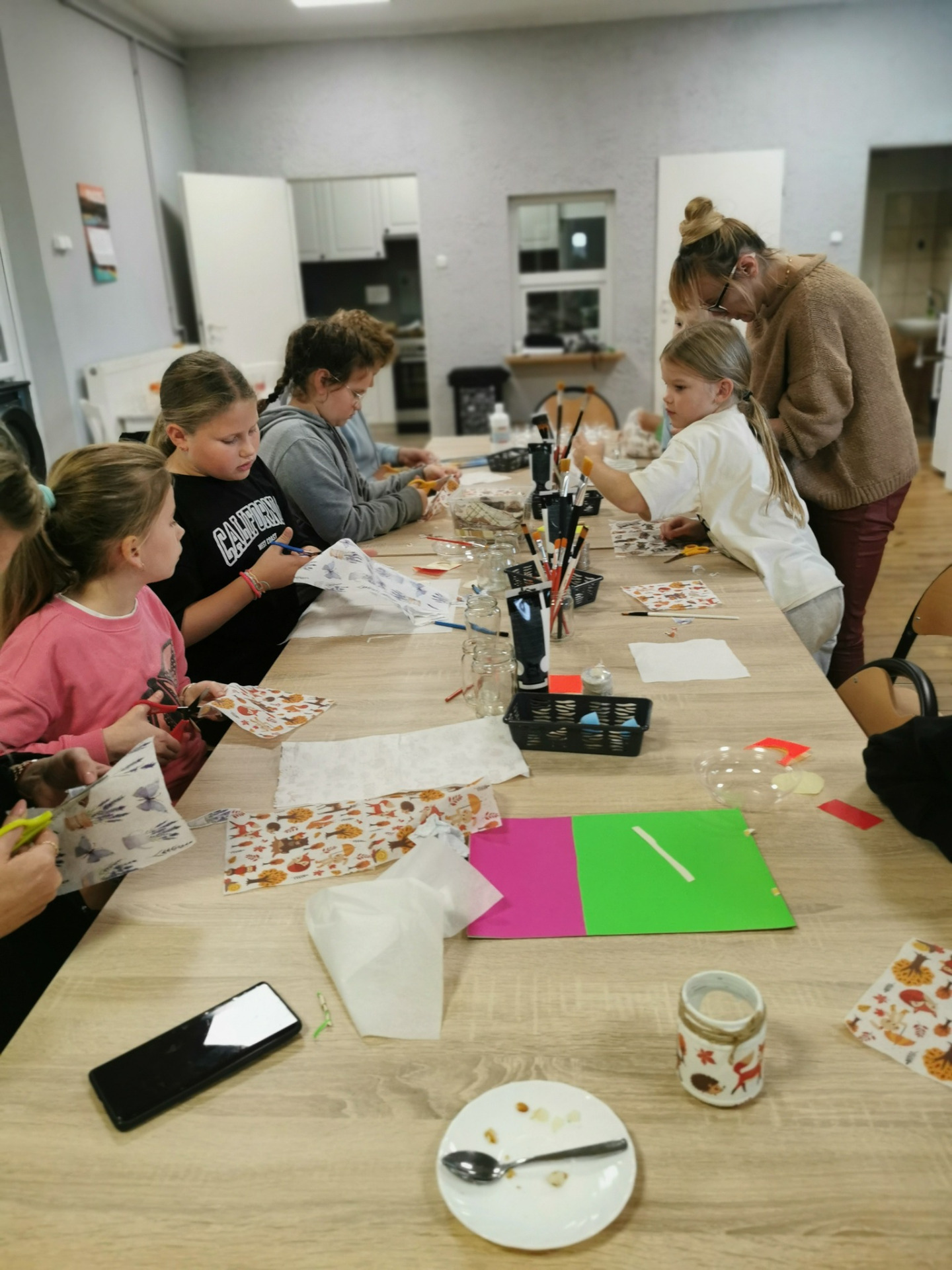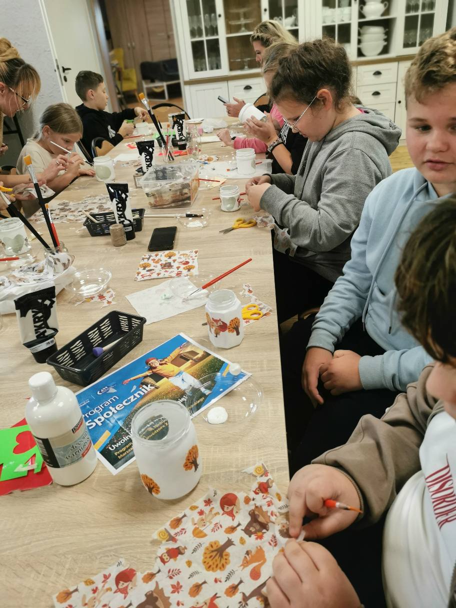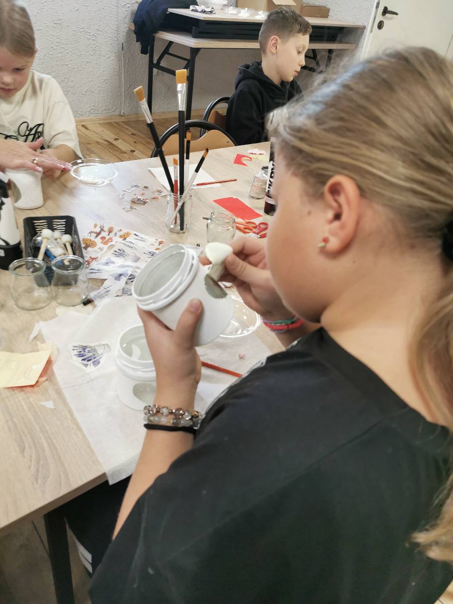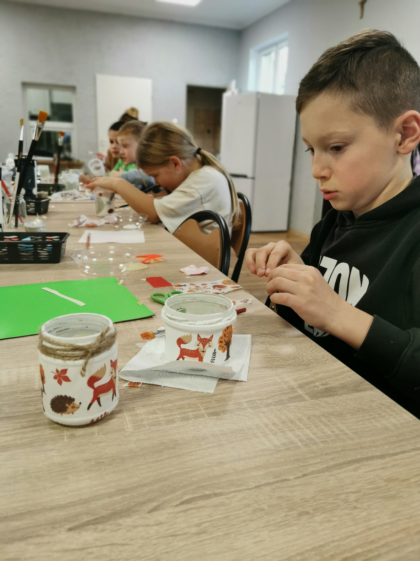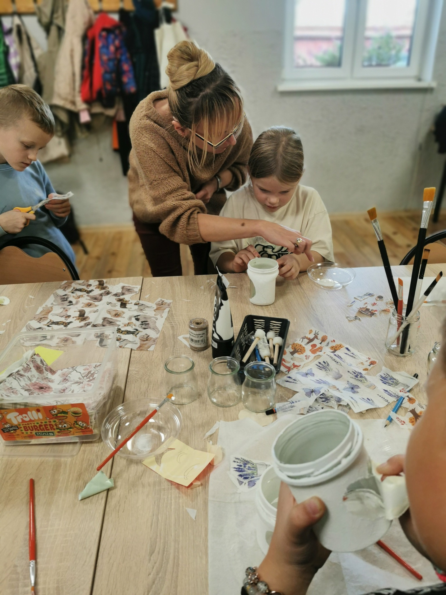 Uczestnicy, pod okiem prowadzących, tworzyli świeczniki techniką decoupage. Zwykłe słoiki, które na co dzień często trafiają do kosza, zamieniły się w prawdziwe małe dzieła sztuki. Dzieci korzystały z kolorowych serwetek, ekologicznych klejów oraz naturalnych ozdób. Każdy świecznik był inny – jedne zachwycały romantycznymi, kwiatowymi motywami, inne wyróżniały się jesienną kolorystyką lub prostotą formy.