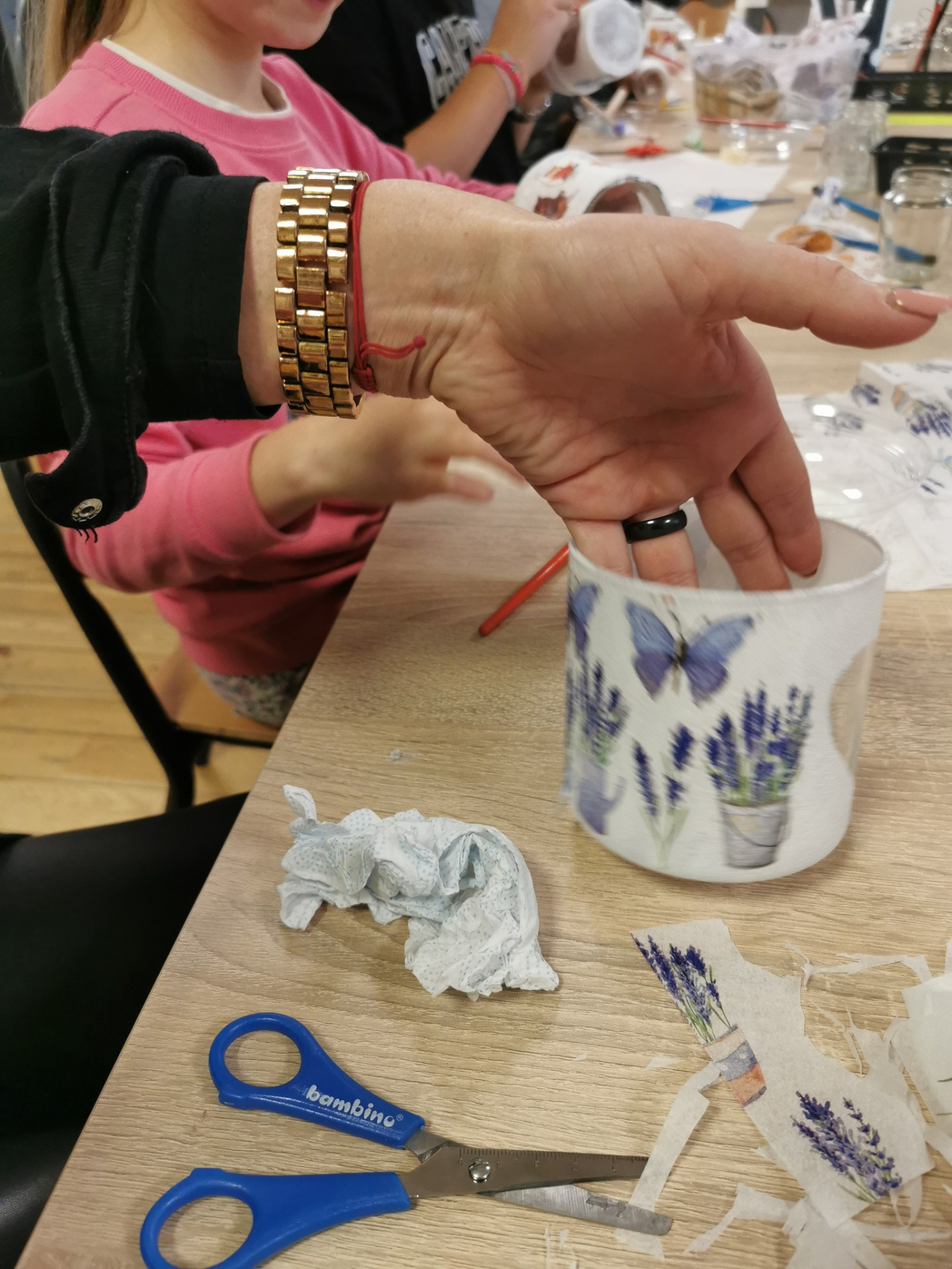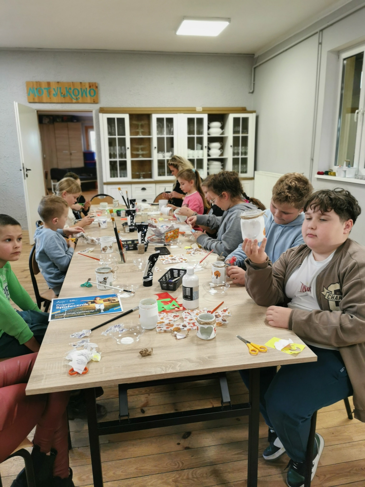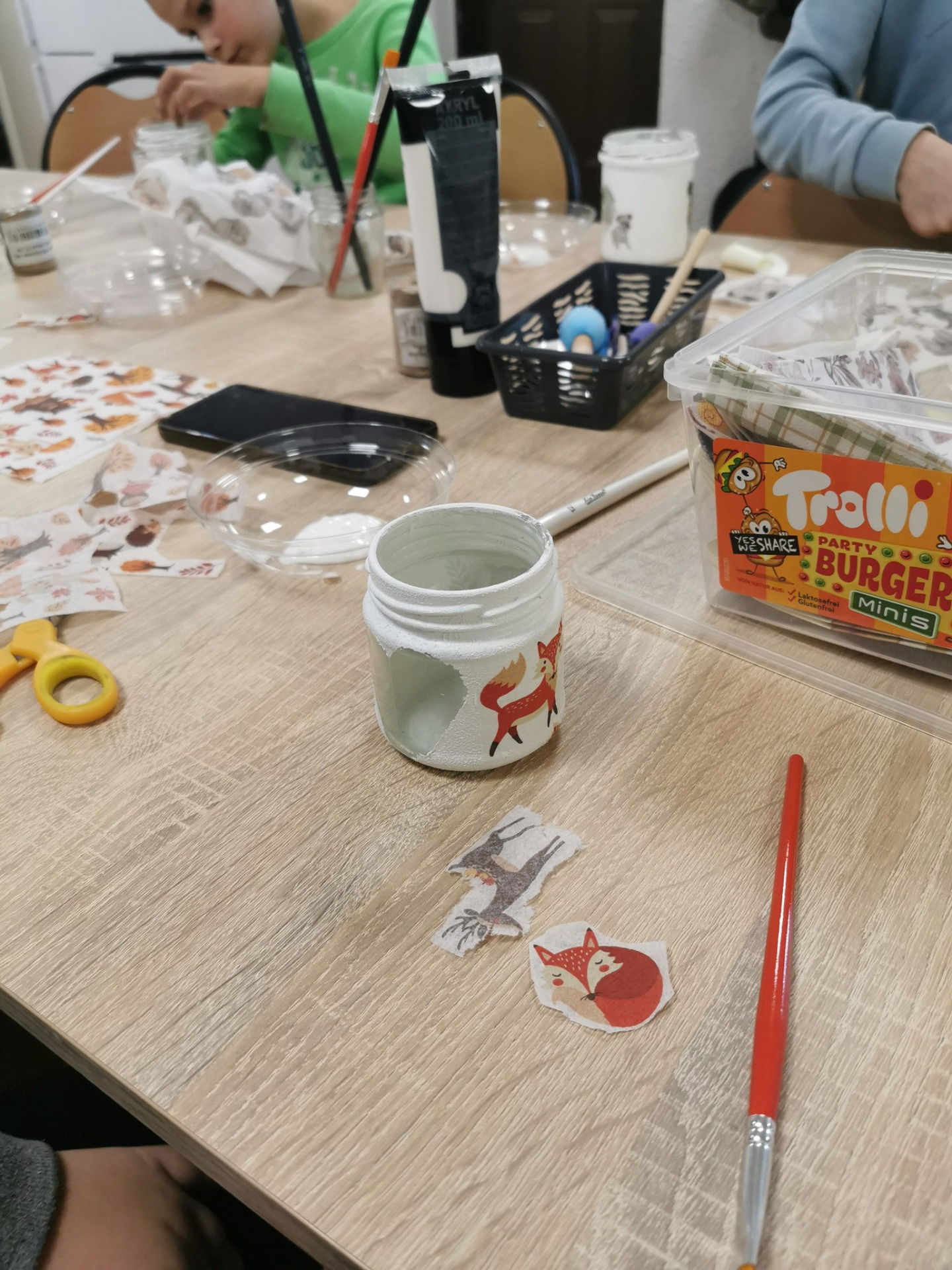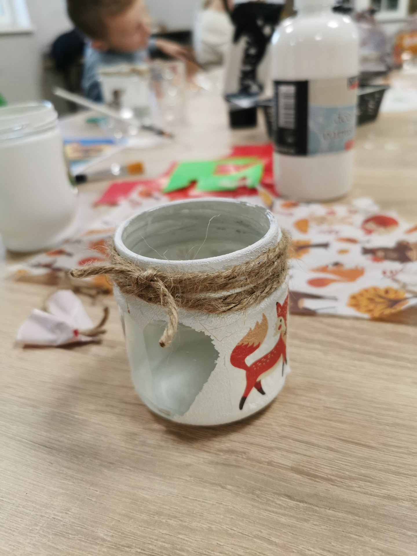 Uczestnicy, pod okiem prowadzących, tworzyli świeczniki techniką decoupage. Zwykłe słoiki, które na co dzień często trafiają do kosza, zamieniły się w prawdziwe małe dzieła sztuki. Dzieci korzystały z kolorowych serwetek, ekologicznych klejów oraz naturalnych ozdób. Każdy świecznik był inny – jedne zachwycały romantycznymi, kwiatowymi motywami, inne wyróżniały się jesienną kolorystyką lub prostotą formy.