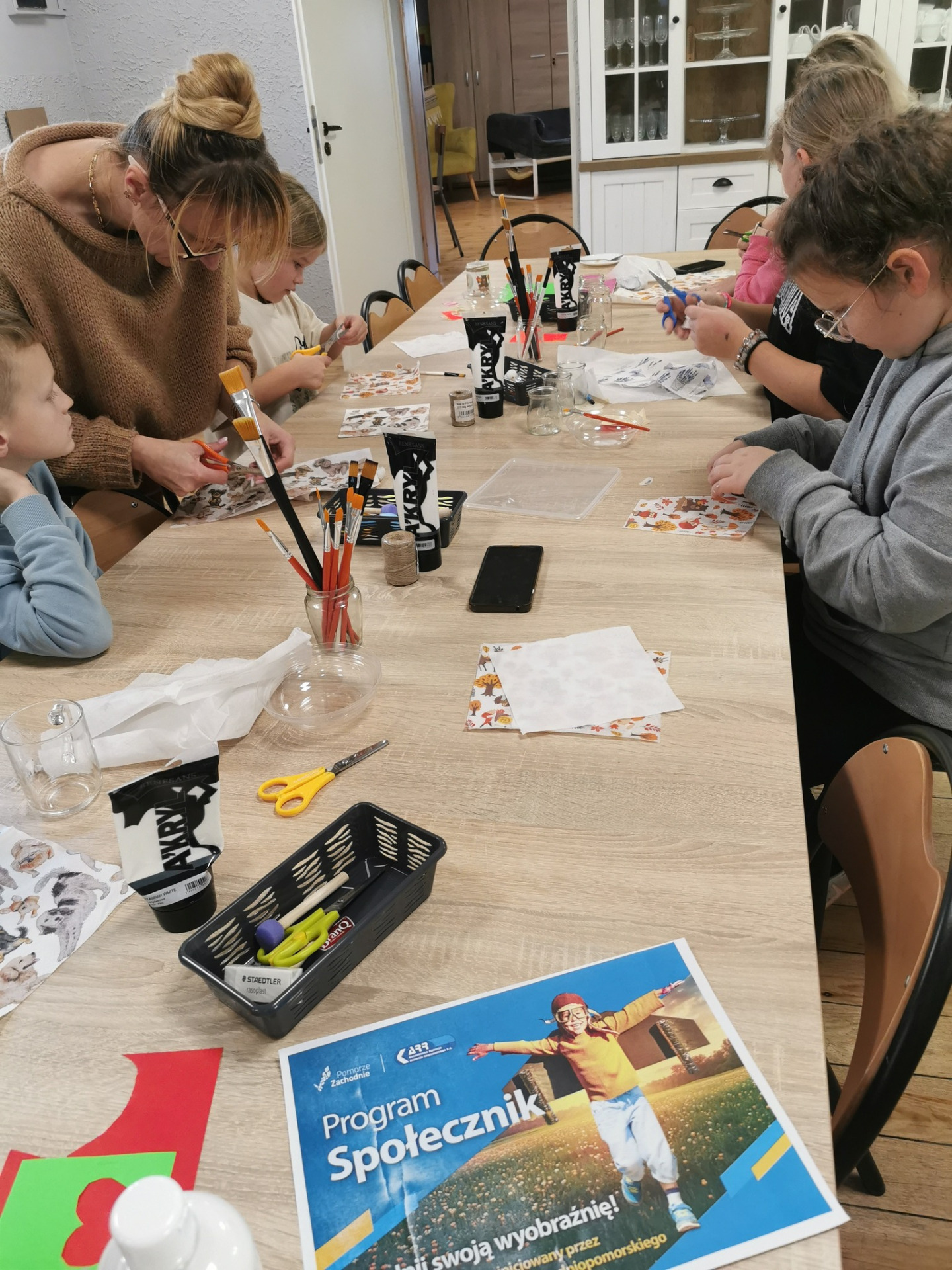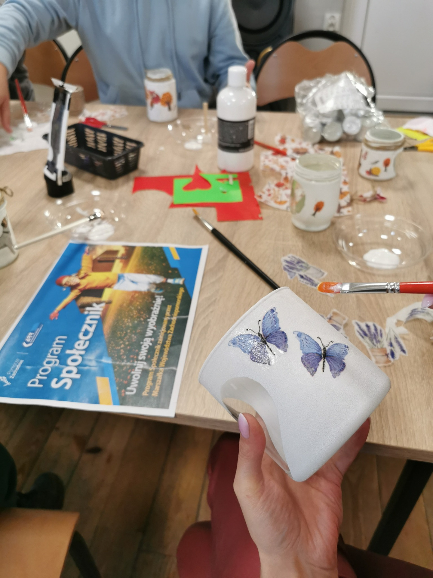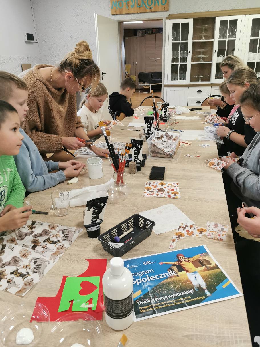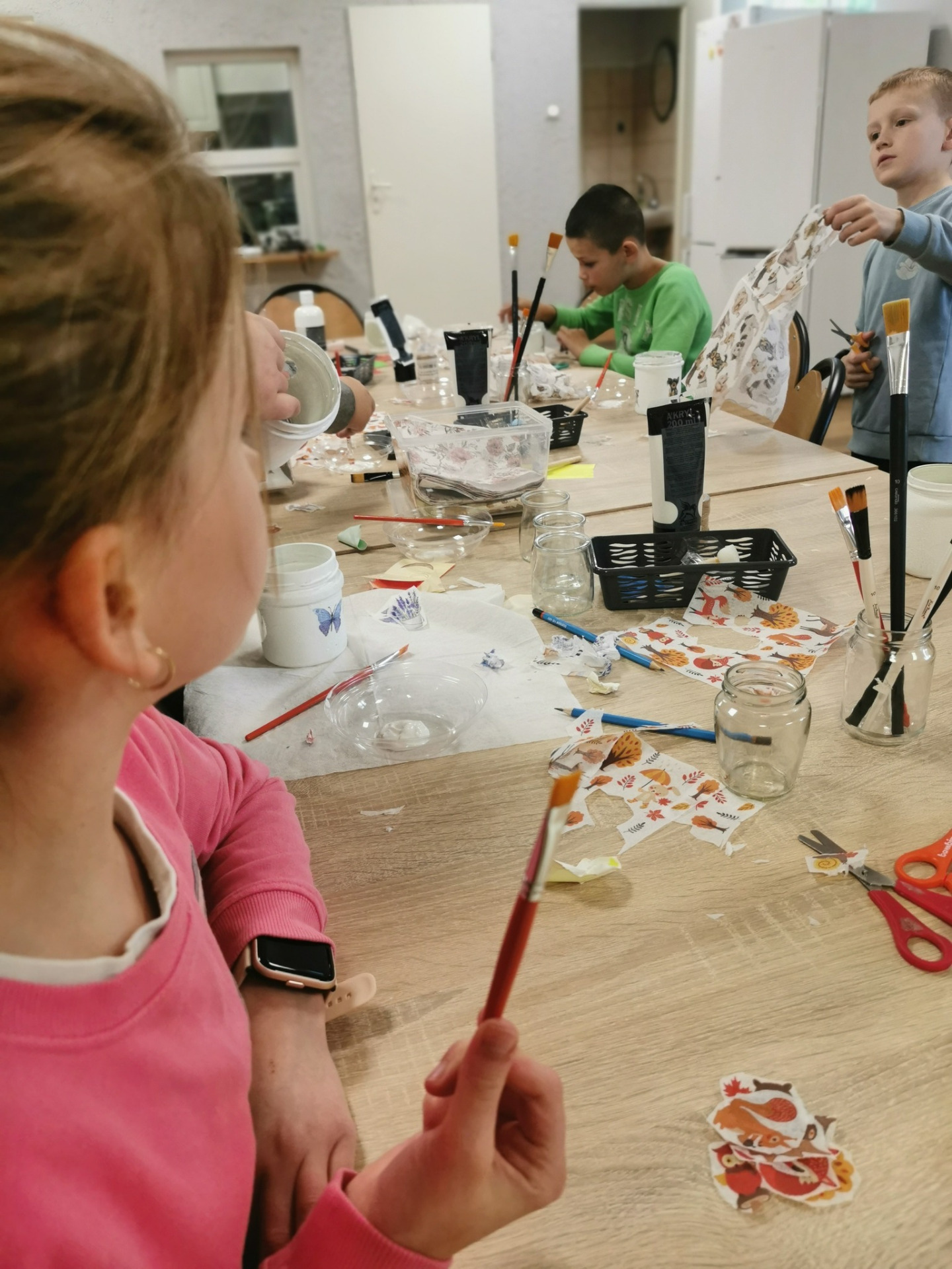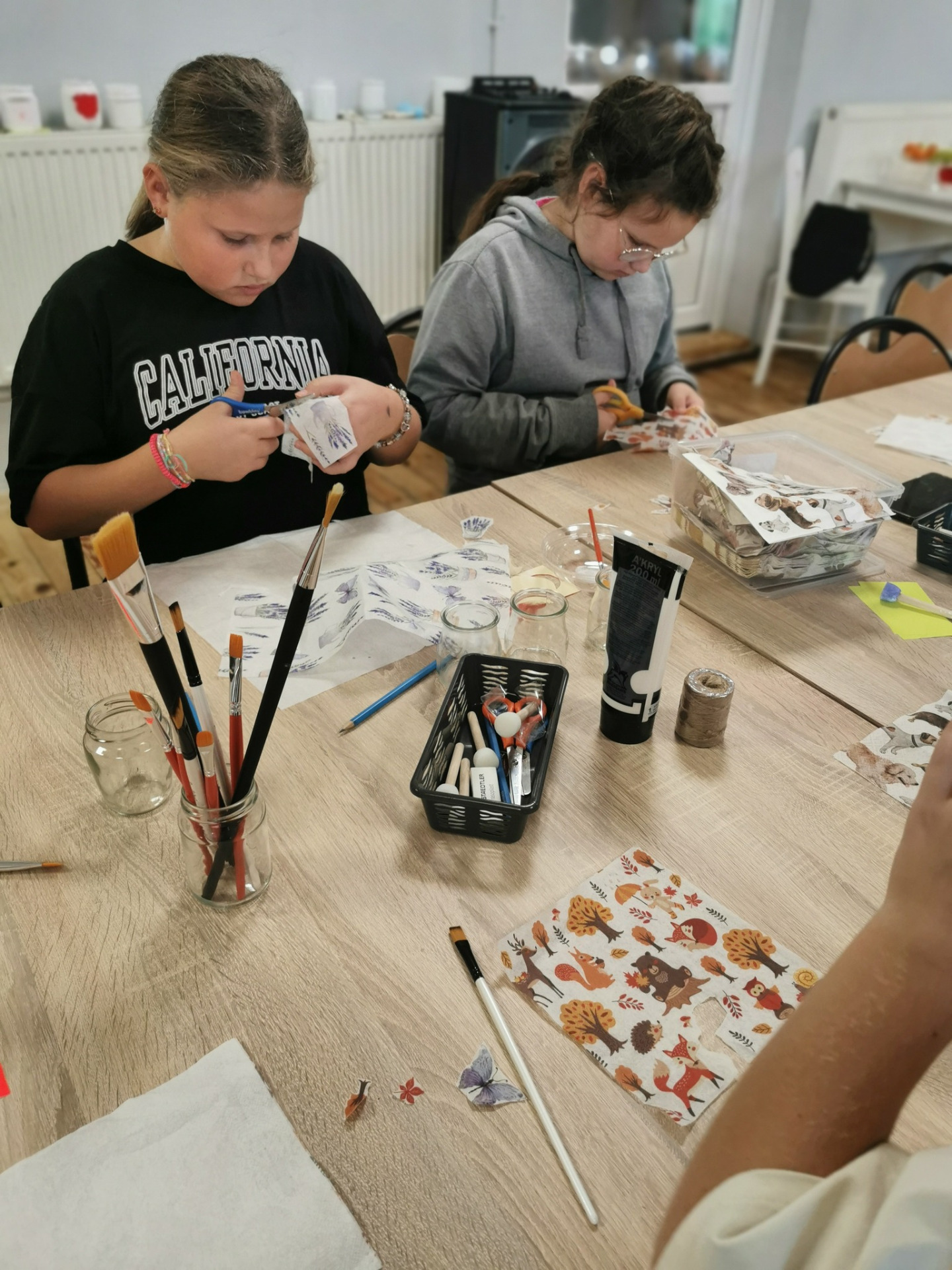 Uczestnicy, pod okiem prowadzących, tworzyli świeczniki techniką decoupage. Zwykłe słoiki, które na co dzień często trafiają do kosza, zamieniły się w prawdziwe małe dzieła sztuki. Dzieci korzystały z kolorowych serwetek, ekologicznych klejów oraz naturalnych ozdób. Każdy świecznik był inny – jedne zachwycały romantycznymi, kwiatowymi motywami, inne wyróżniały się jesienną kolorystyką lub prostotą formy.