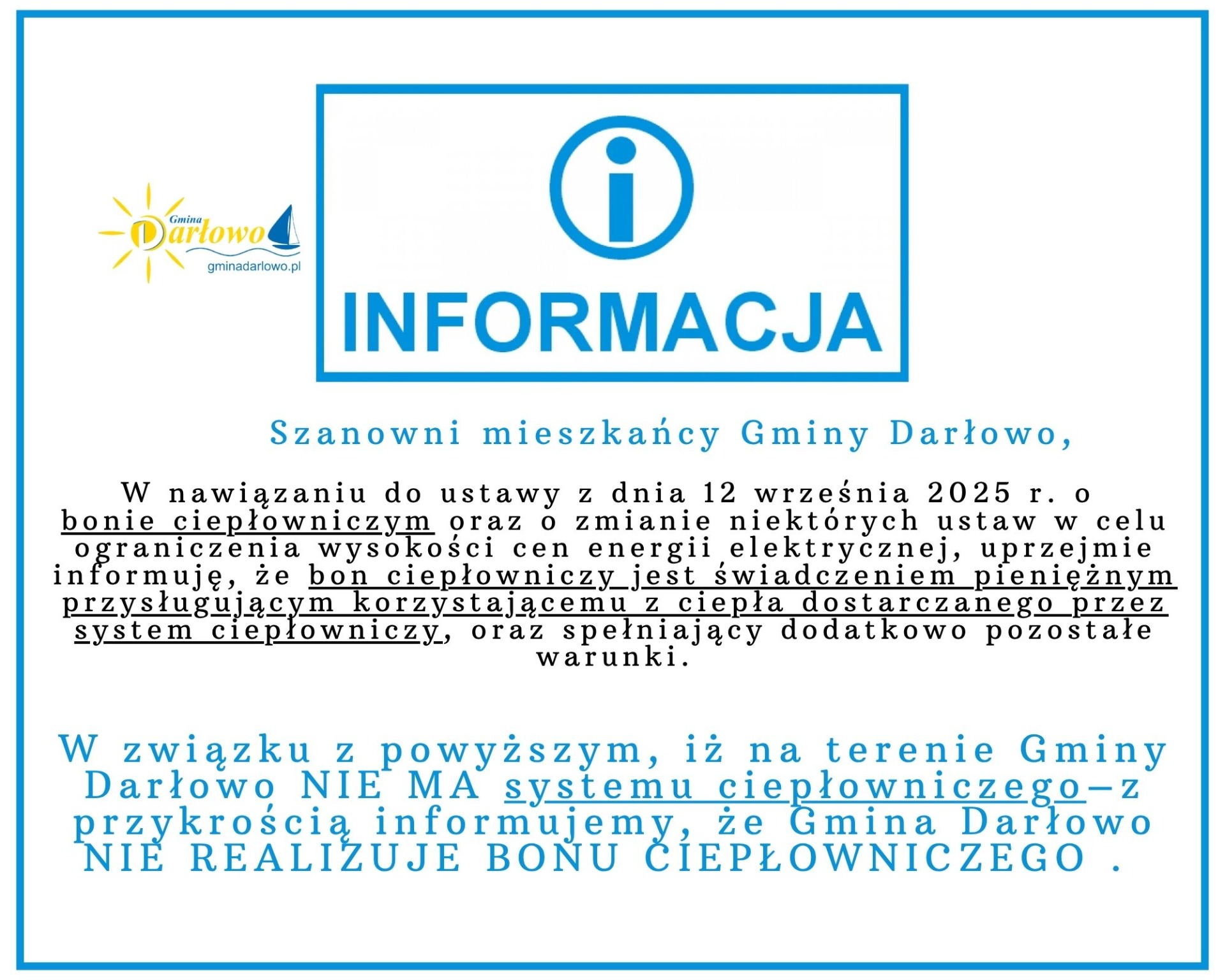 W związku z powyższym, iż na terenie Gminy Darłowo nie ma systemu ciepłowniczego – z przykrością informujemy, że Gmina Darłowo nie realizuje bonu ciepłowniczego.
