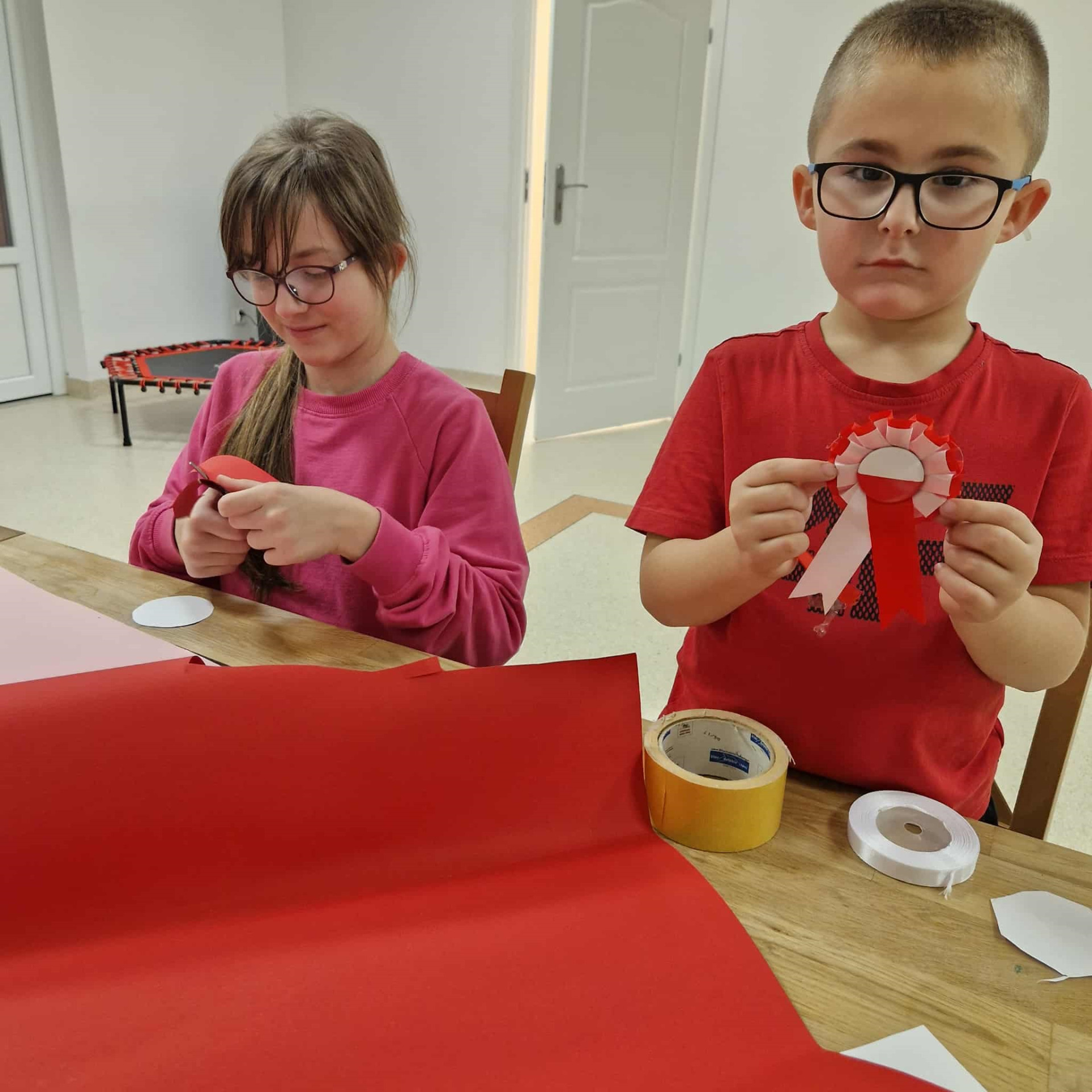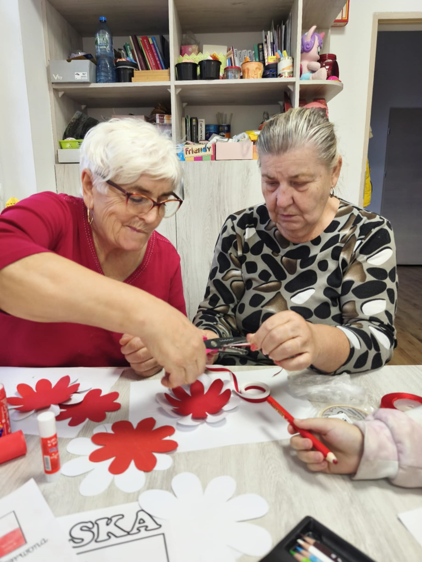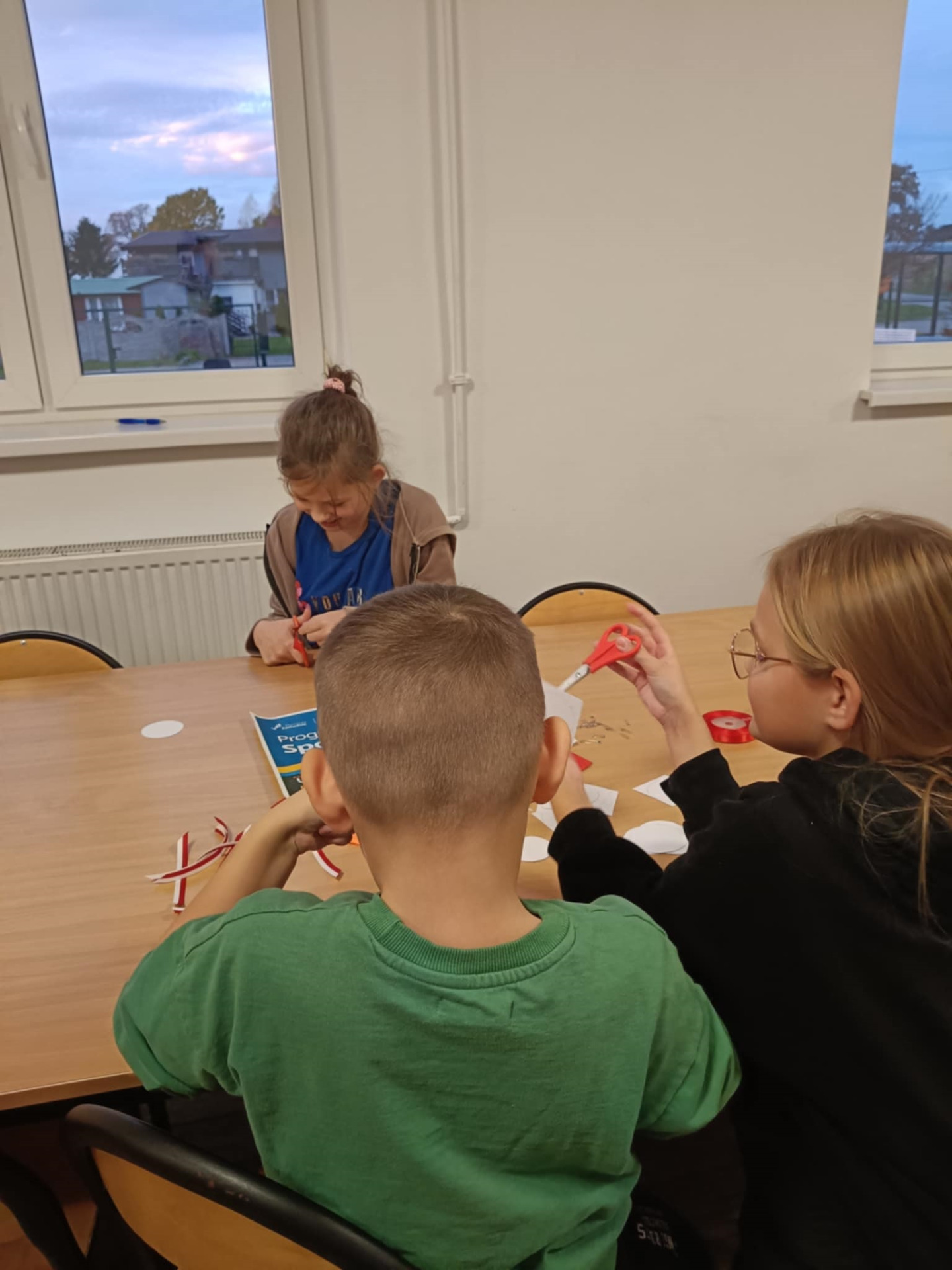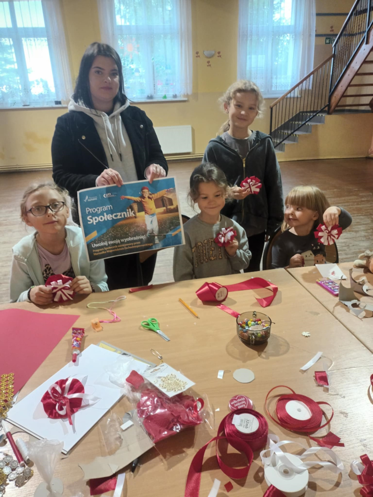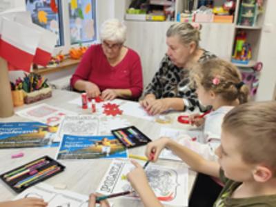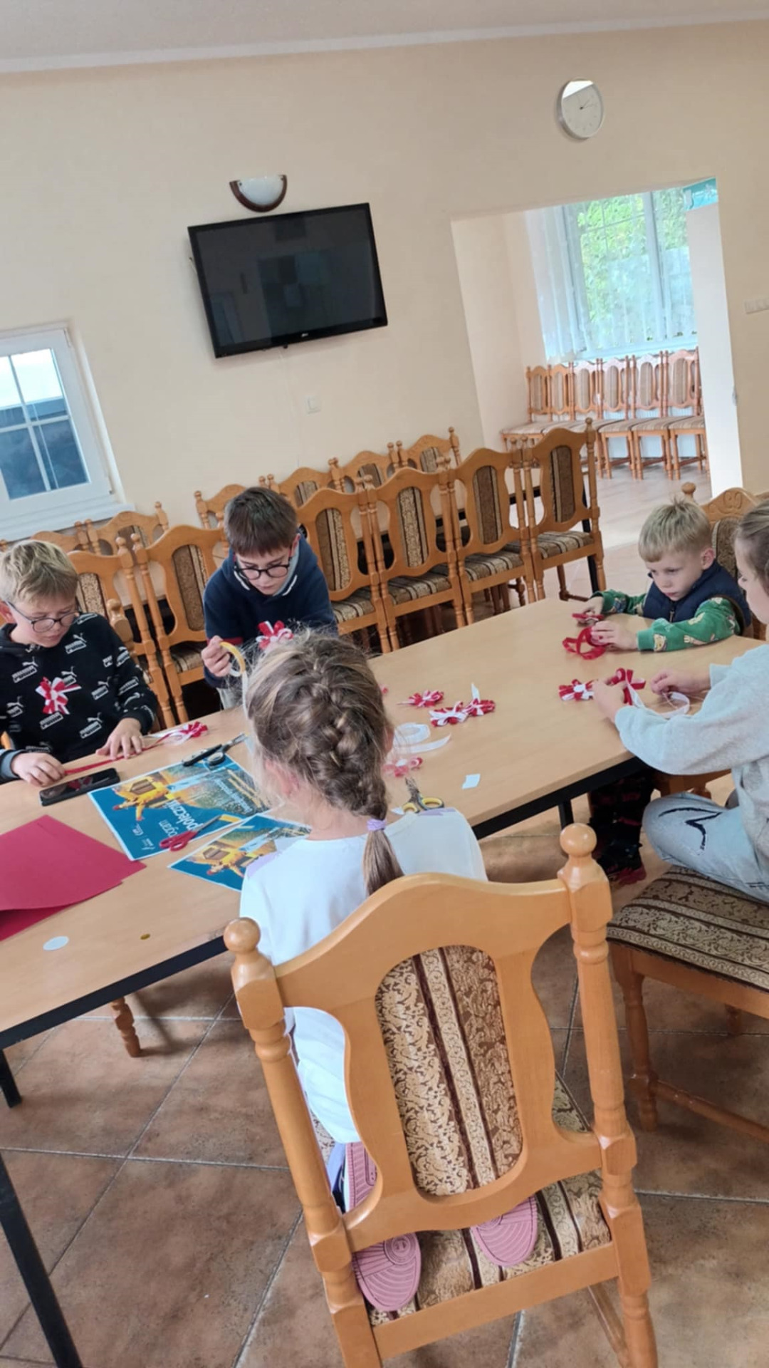 Atmosfera warsztatów była pełna skupienia, przyjaznych rozmów i międzypokoleniowej współpracy. Dzieci z ciekawością poznawały znaczenie narodowych barw, dzieci i młodzież z dumą angażowała się w tworzenie kotylionów, a dorośli dzielili się wspomnieniami o dawnych obchodach 11 listopada. Wspólne działania sprawiły, że edukacja historyczna stała się naturalną częścią twórczej zabawy – inspirującą i pełną ciepła.
