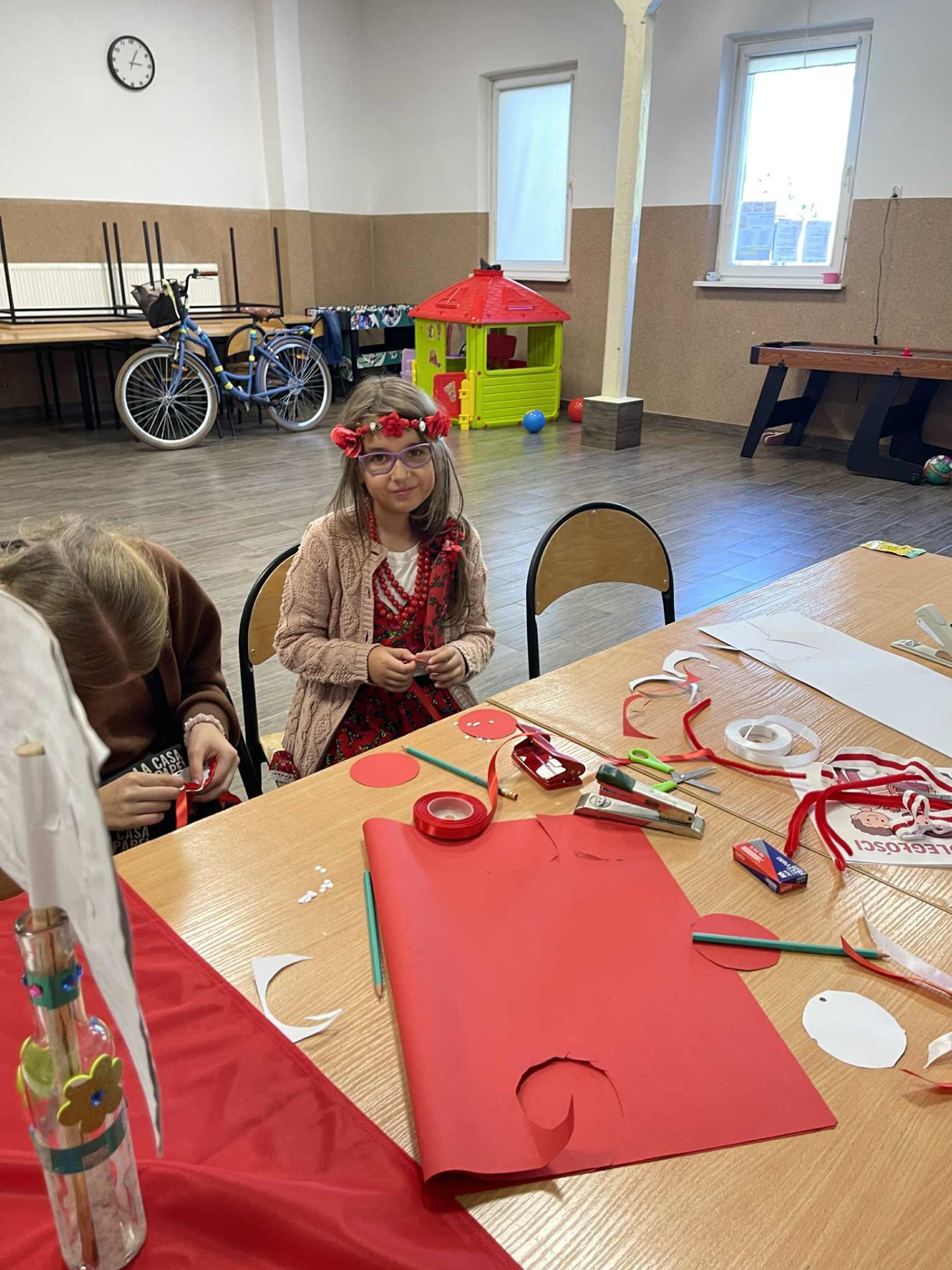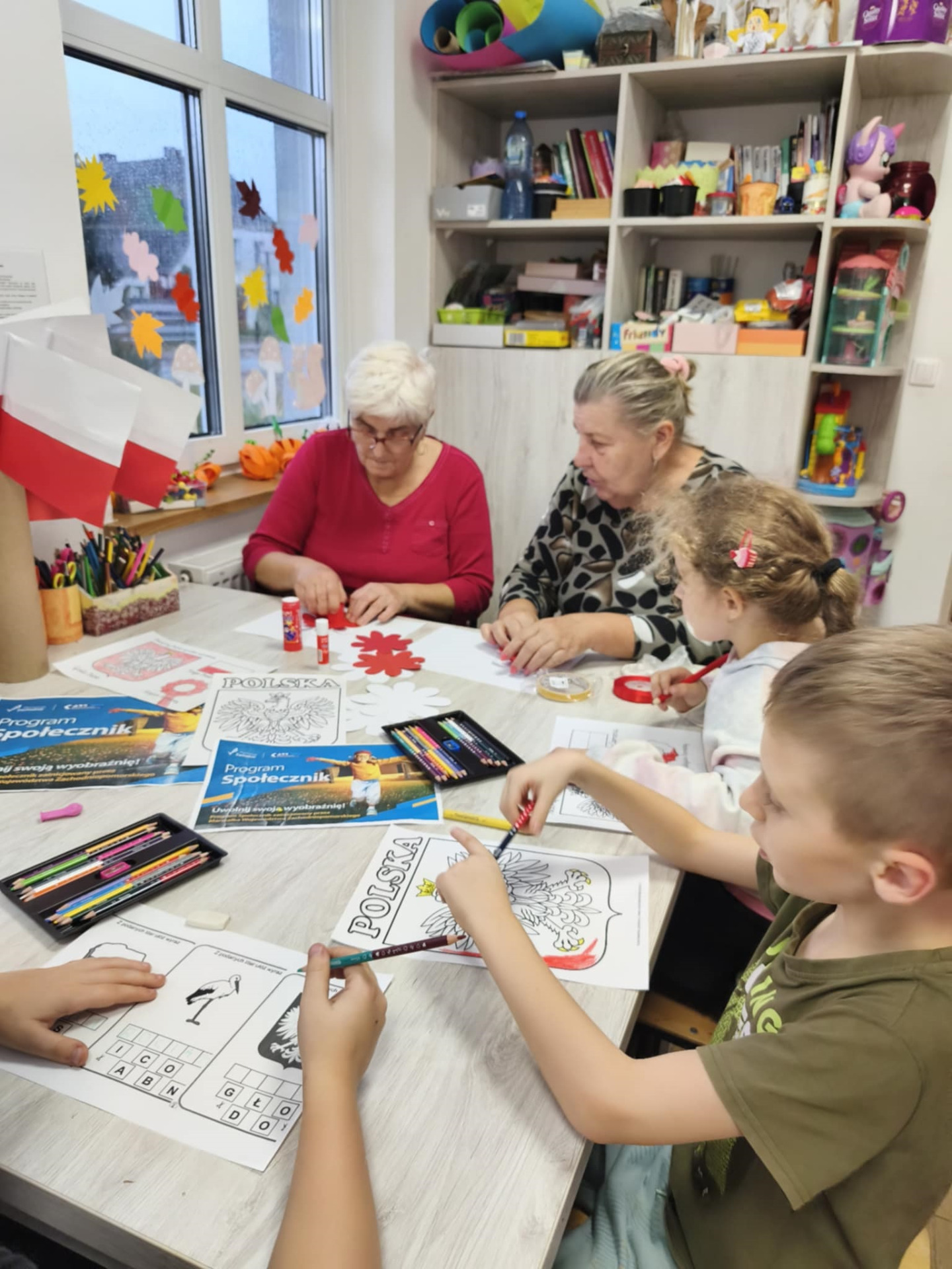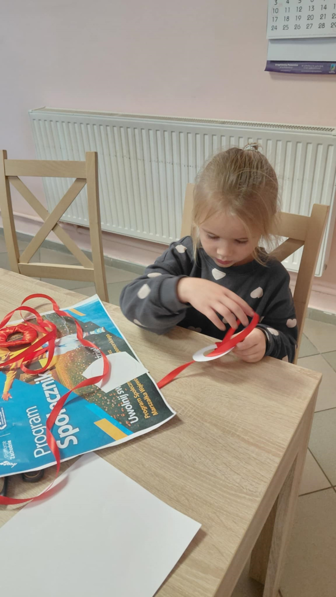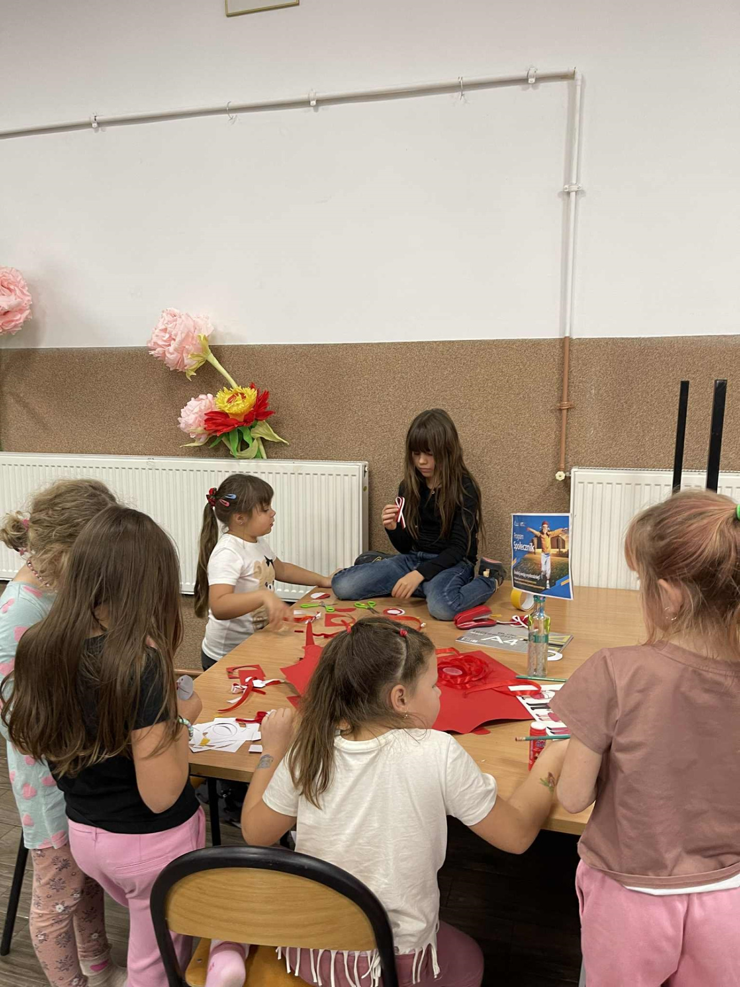 Atmosfera warsztatów była pełna skupienia, przyjaznych rozmów i międzypokoleniowej współpracy. Dzieci z ciekawością poznawały znaczenie narodowych barw, dzieci i młodzież z dumą angażowała się w tworzenie kotylionów, a dorośli dzielili się wspomnieniami o dawnych obchodach 11 listopada. Wspólne działania sprawiły, że edukacja historyczna stała się naturalną częścią twórczej zabawy – inspirującą i pełną ciepła.
