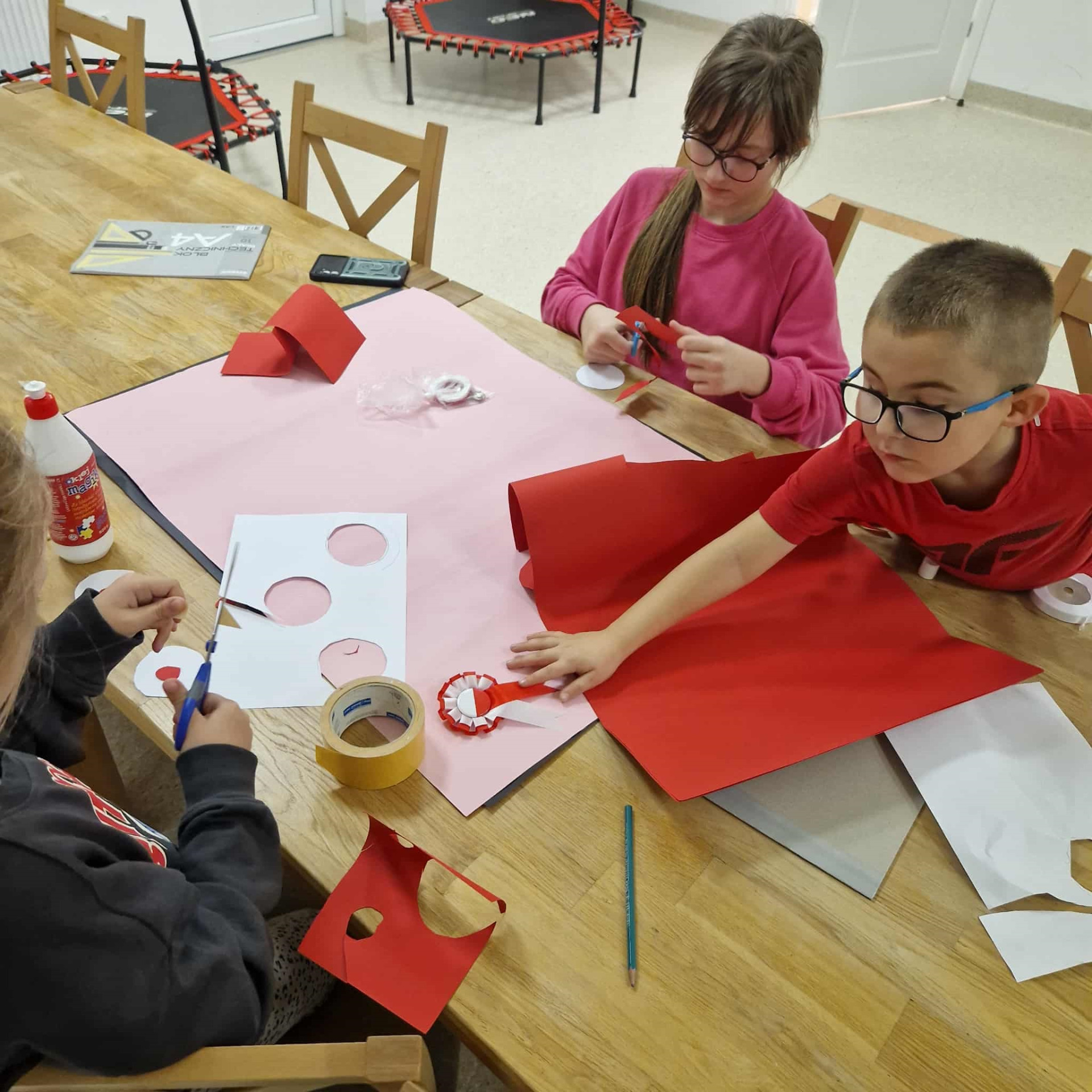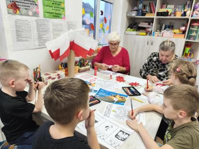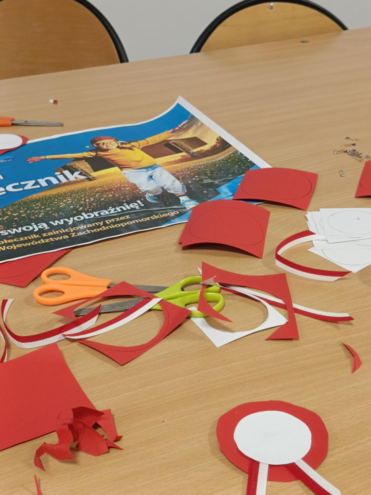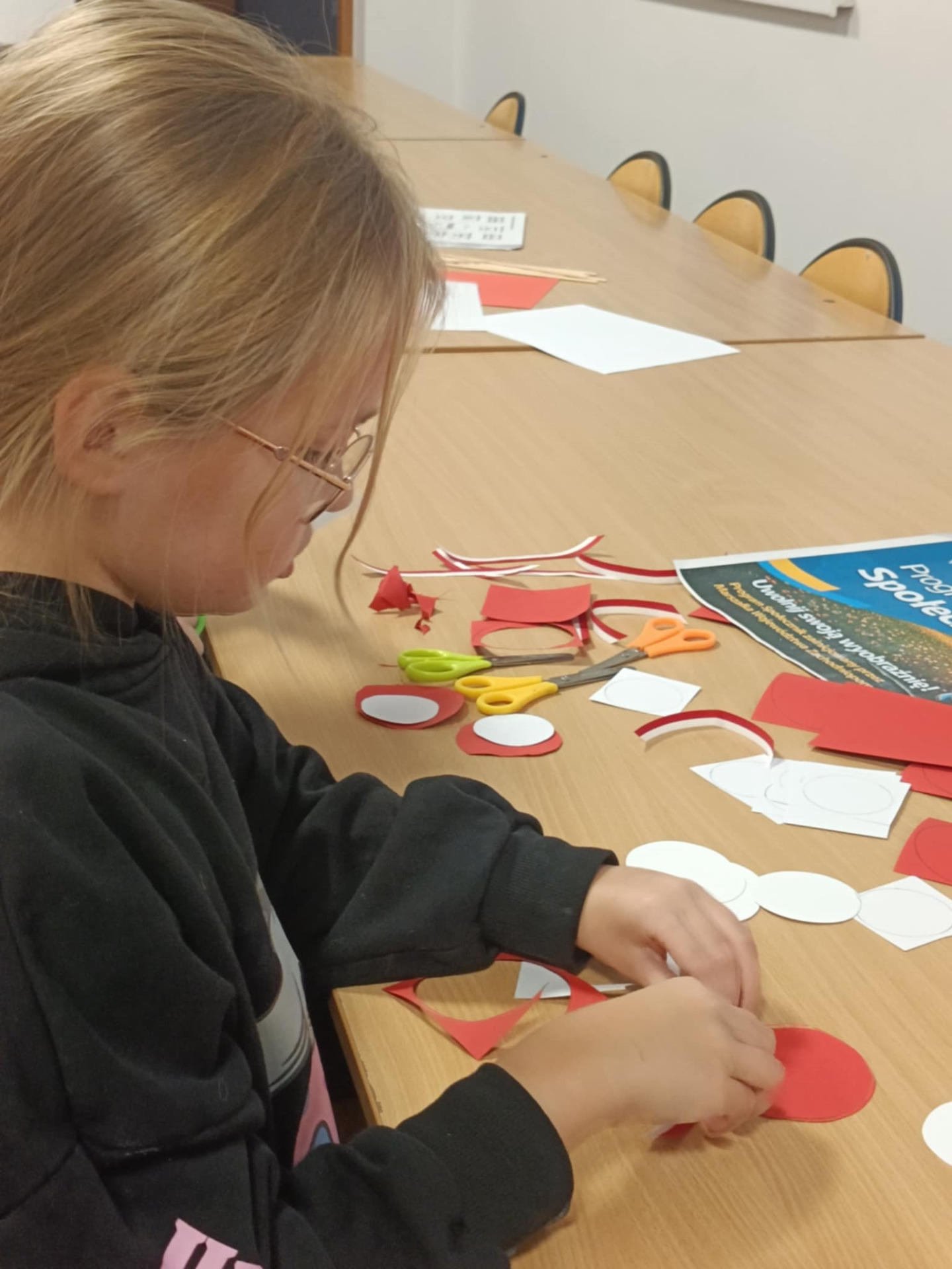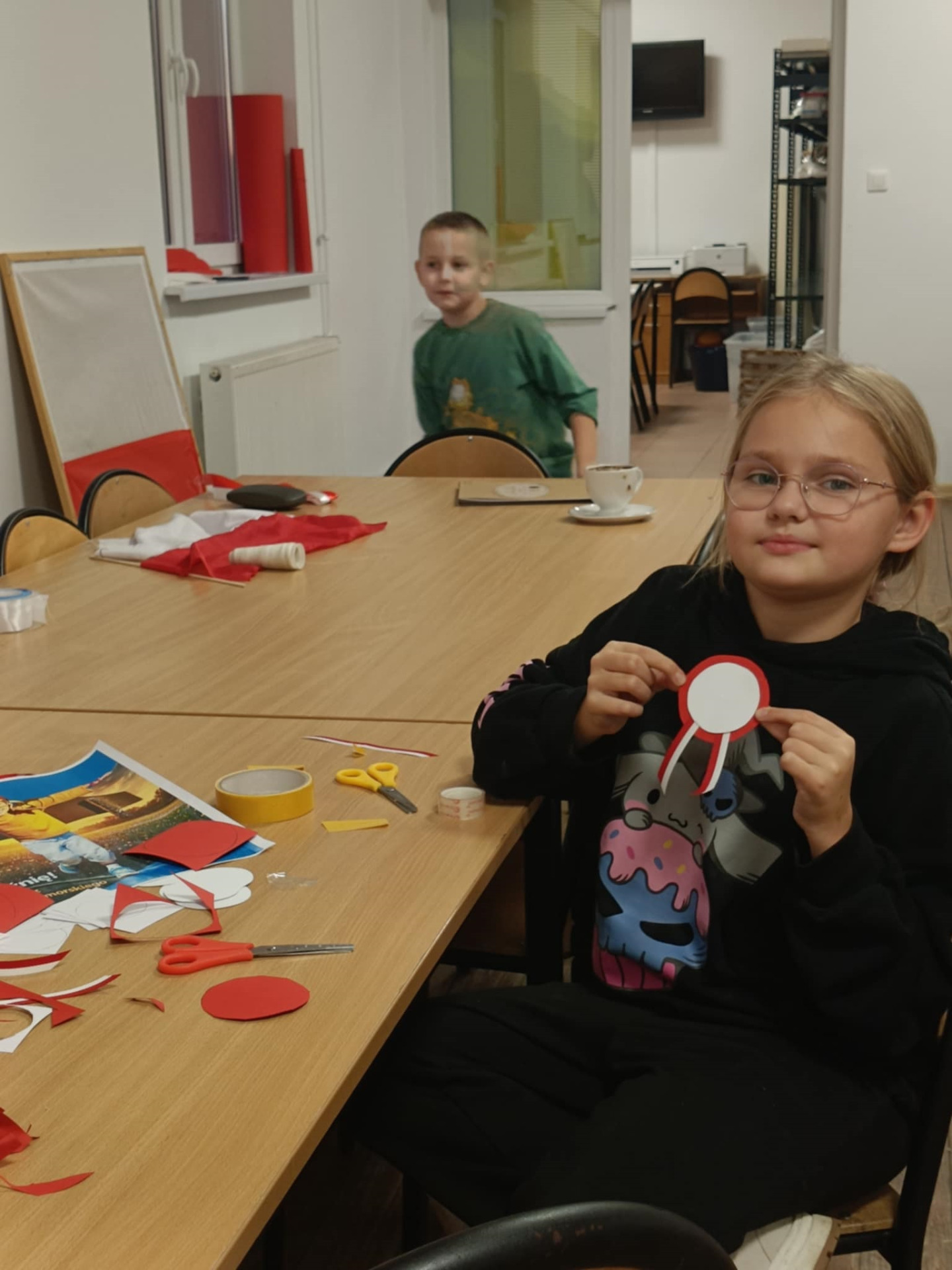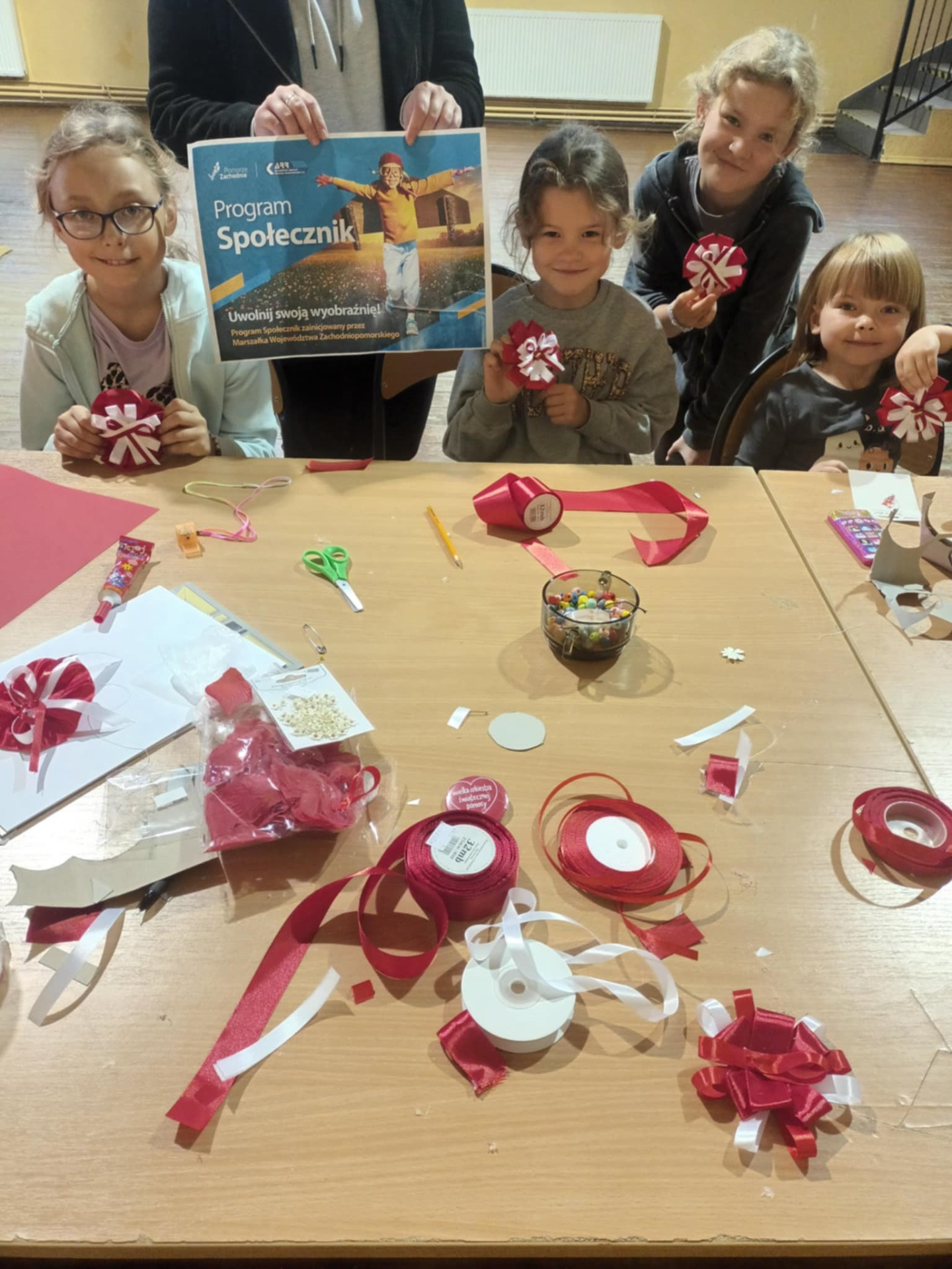 Atmosfera warsztatów była pełna skupienia, przyjaznych rozmów i międzypokoleniowej współpracy. Dzieci z ciekawością poznawały znaczenie narodowych barw, dzieci i młodzież z dumą angażowała się w tworzenie kotylionów, a dorośli dzielili się wspomnieniami o dawnych obchodach 11 listopada. Wspólne działania sprawiły, że edukacja historyczna stała się naturalną częścią twórczej zabawy – inspirującą i pełną ciepła.