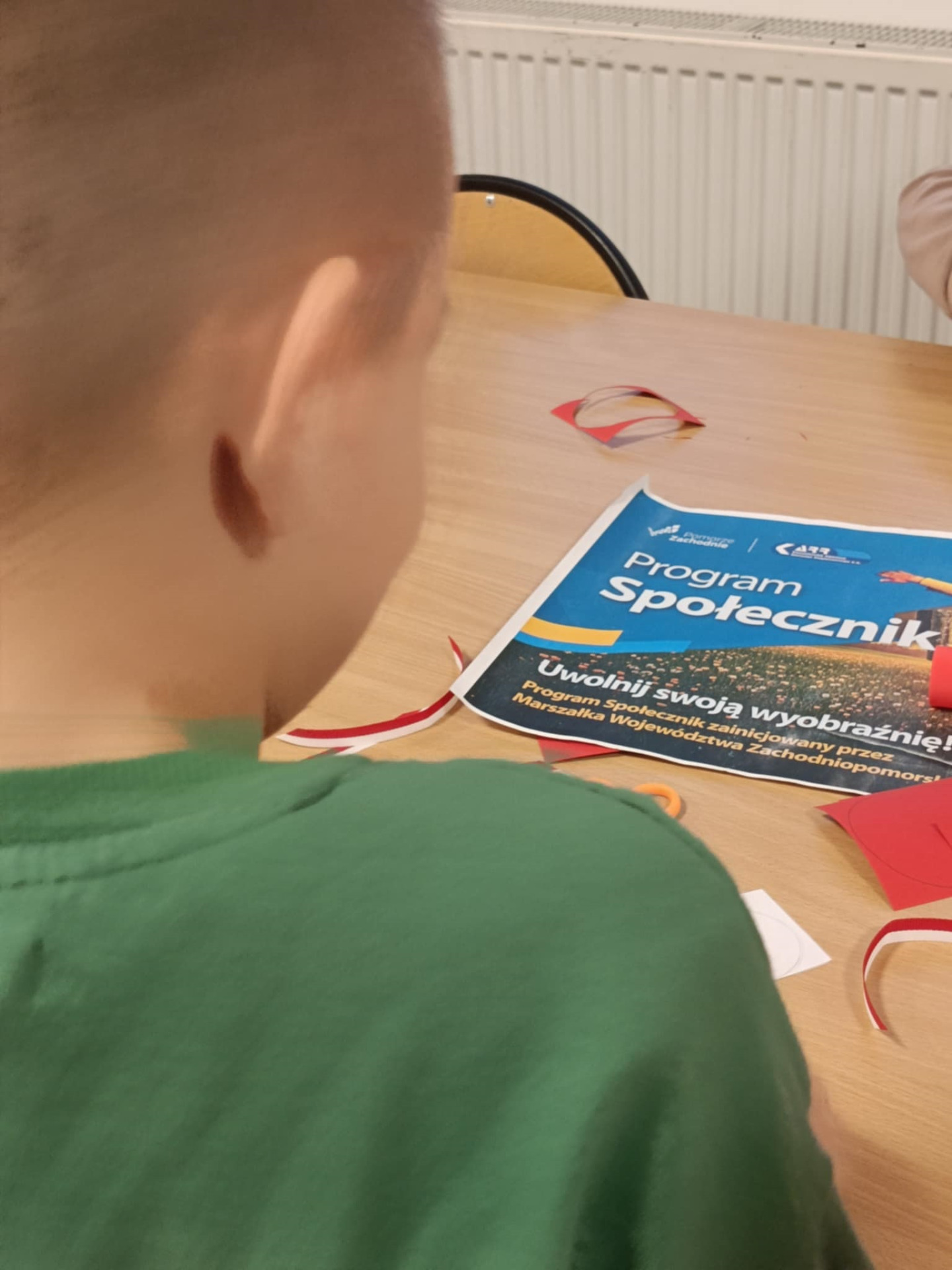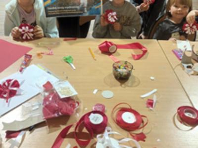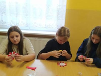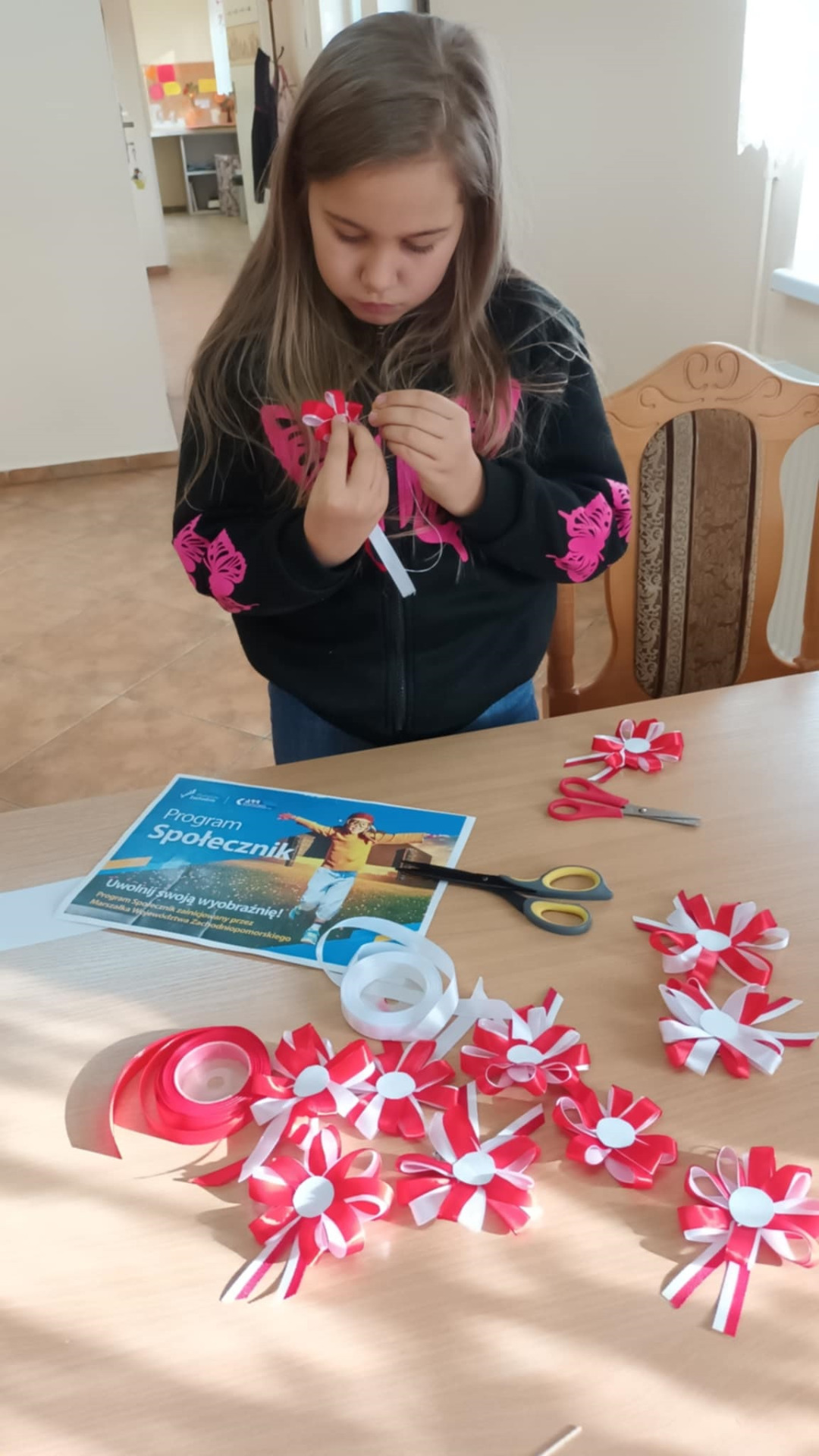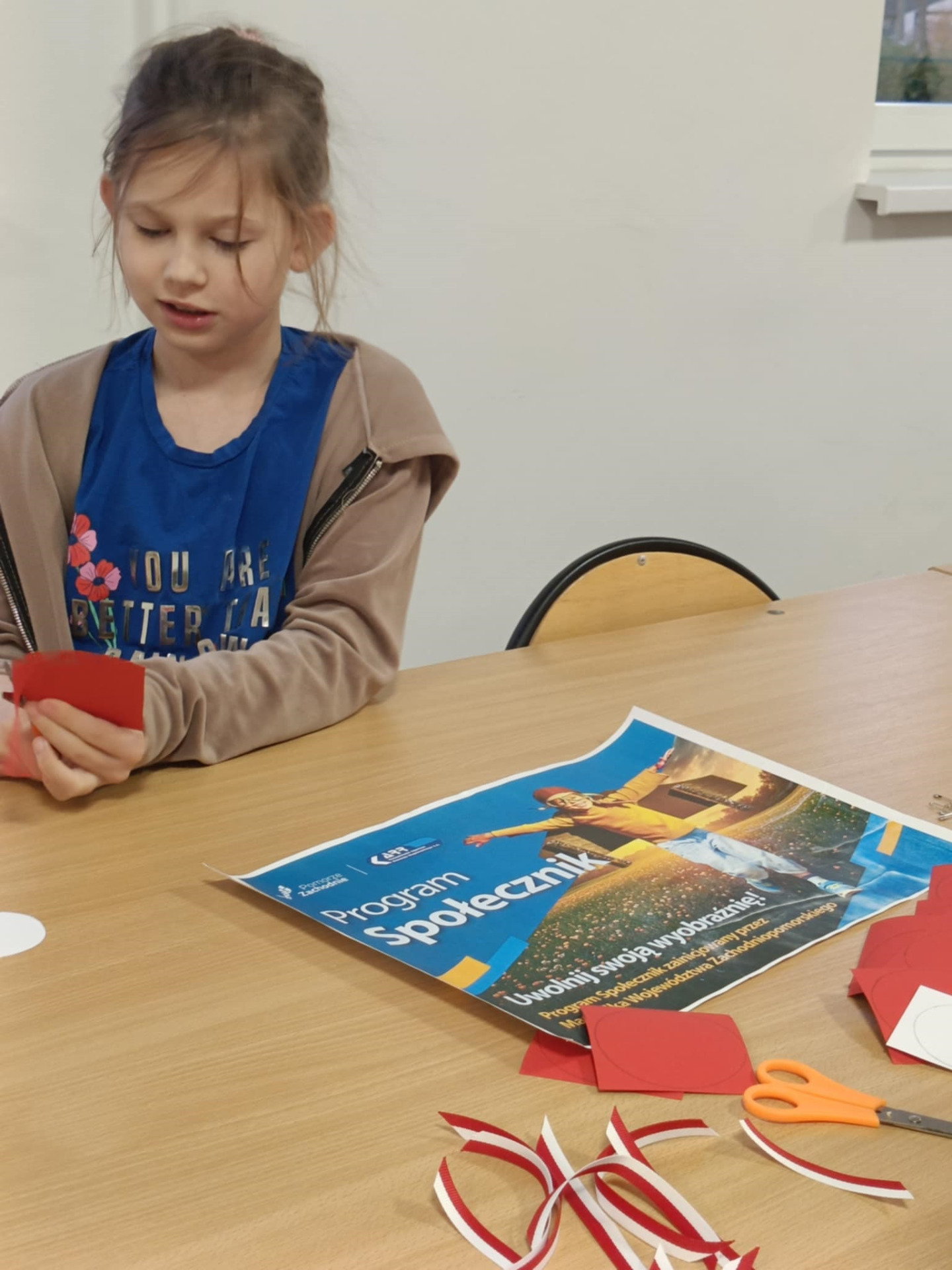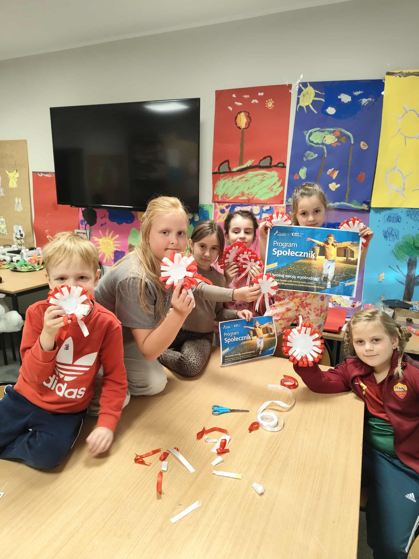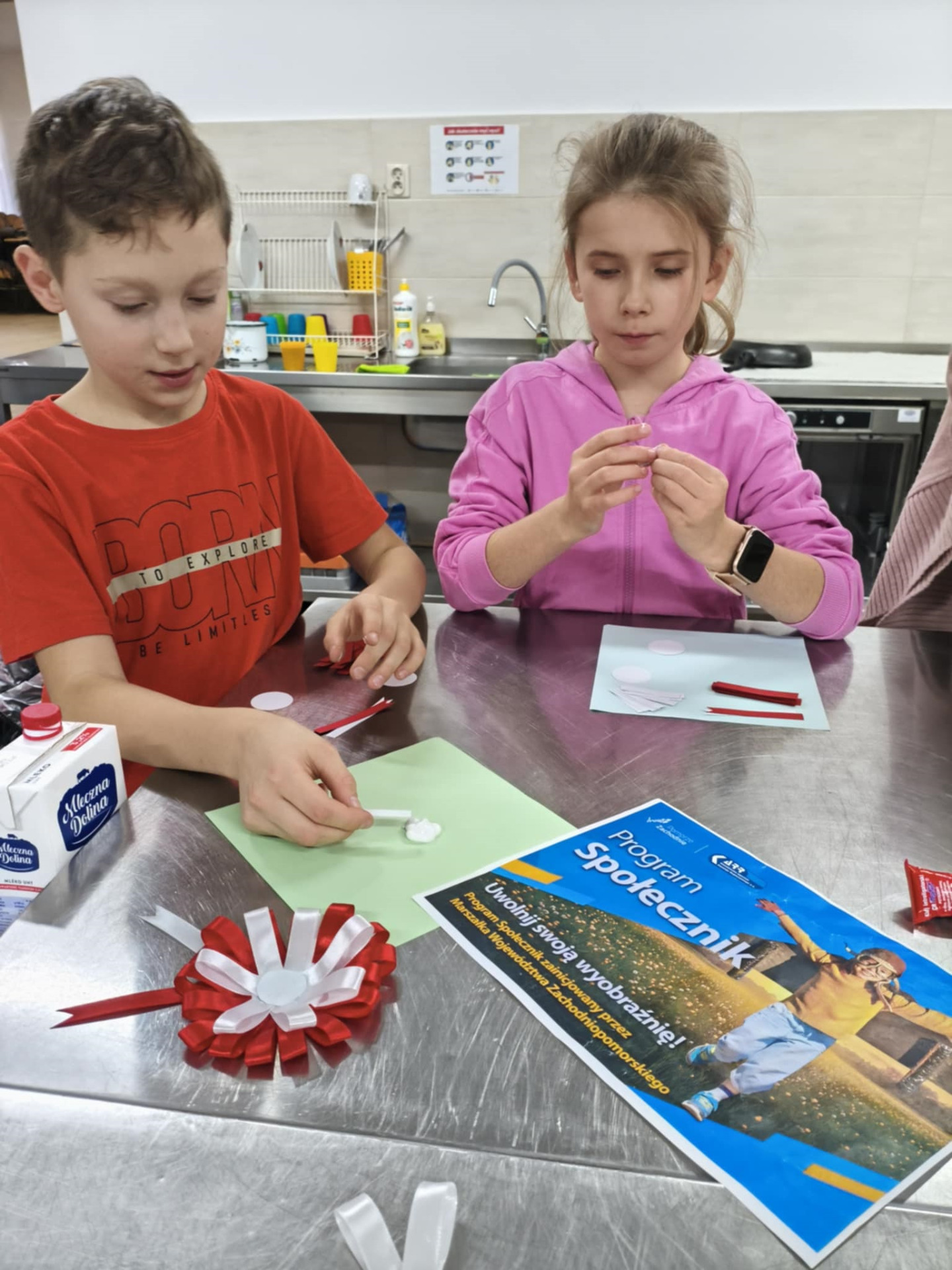 Atmosfera warsztatów była pełna skupienia, przyjaznych rozmów i międzypokoleniowej współpracy. Dzieci z ciekawością poznawały znaczenie narodowych barw, dzieci i młodzież z dumą angażowała się w tworzenie kotylionów, a dorośli dzielili się wspomnieniami o dawnych obchodach 11 listopada. Wspólne działania sprawiły, że edukacja historyczna stała się naturalną częścią twórczej zabawy – inspirującą i pełną ciepła.