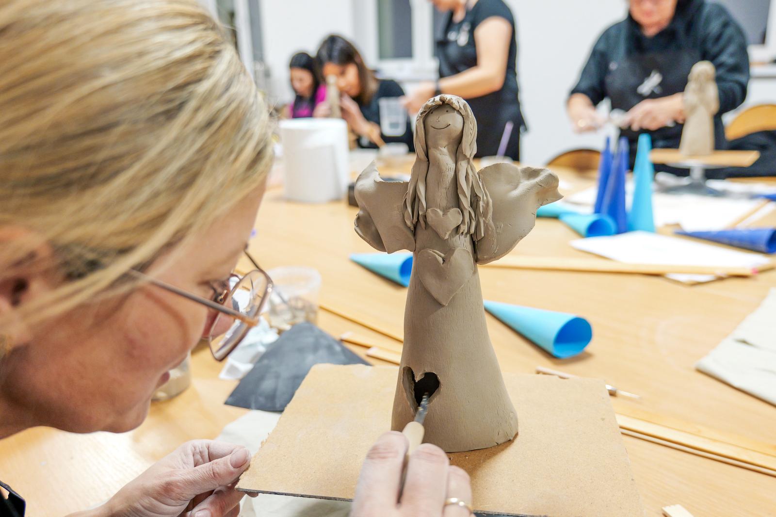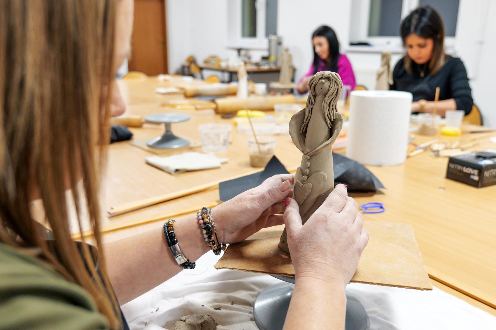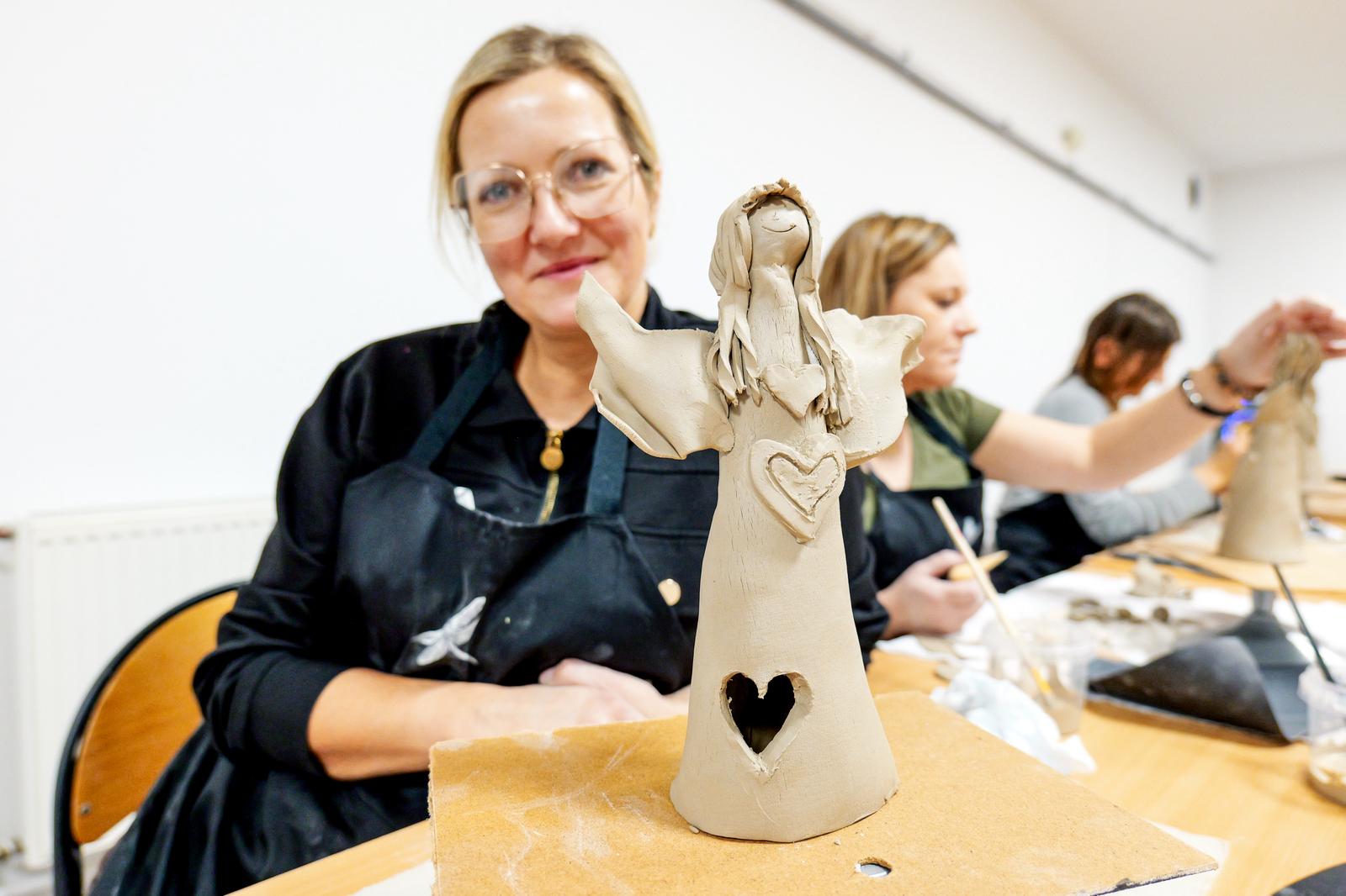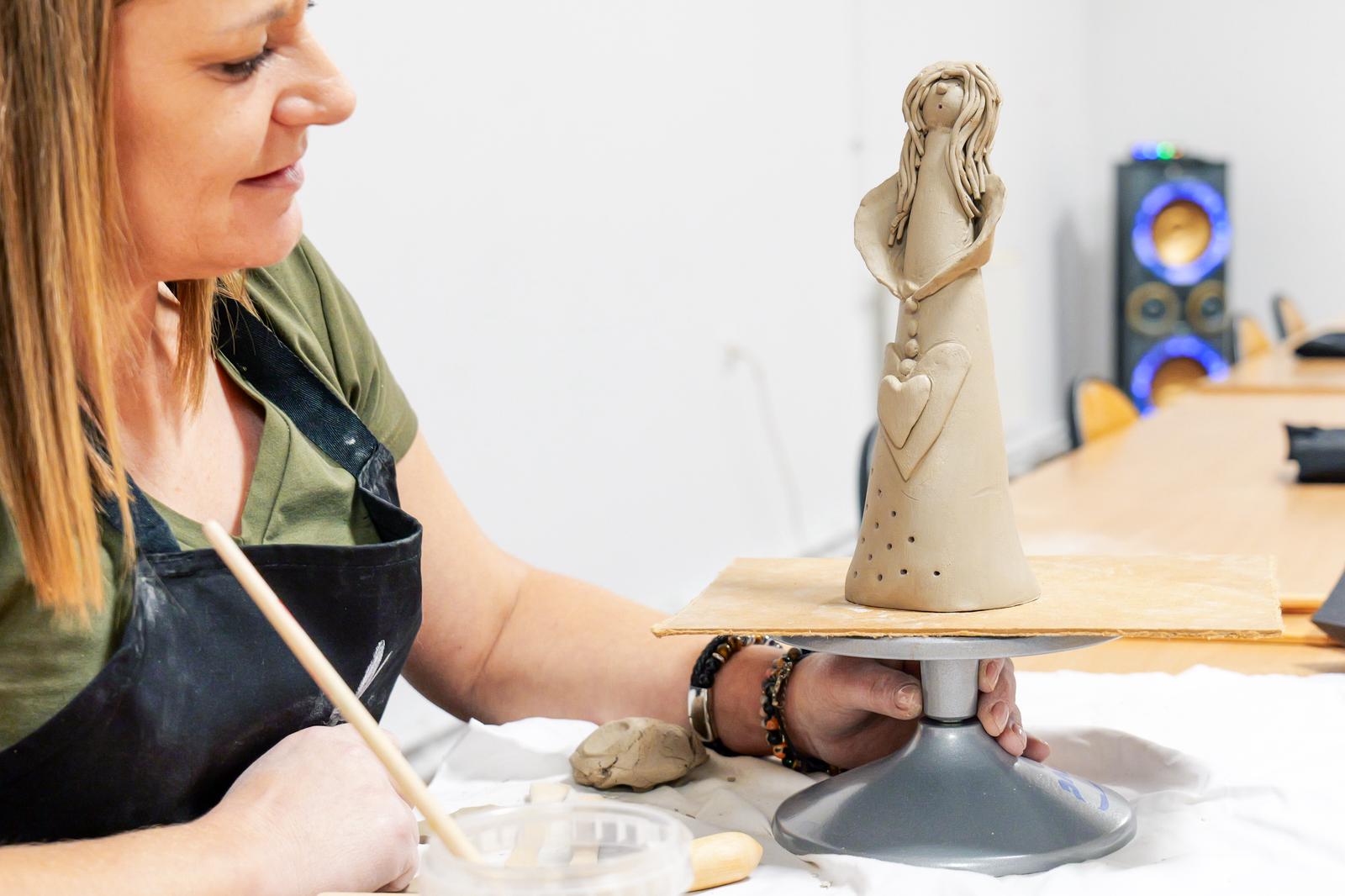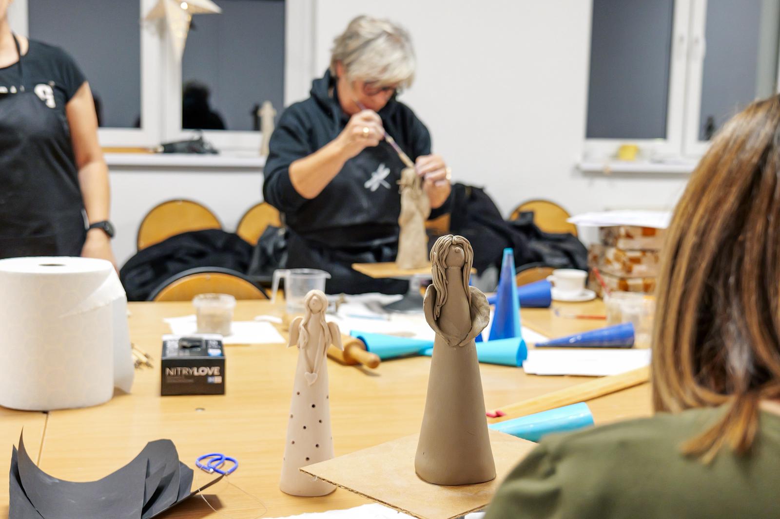 Powstały prace pełne wrażliwości i indywidualnego stylu. Jedne anielice miały klasyczne, smukłe sylwetki, inne charakteryzowały się nowoczesną formą lub bogatymi zdobieniami. Choć każda z uczestniczek otrzymała ten sam materiał, rezultaty jasno pokazały, jaką moc mają kreatywność i swoboda artystyczna. Zajęcia pokazały również, jak ważna jest przestrzeń, w której można odpocząć od codzienności i zanurzyć się w sztuce — nawet jeśli stawia się dopiero pierwsze kroki. Nadszedł na suszenia powstałych prac do wypału, niebawem spotkamy się na ich szkliwieniu.
