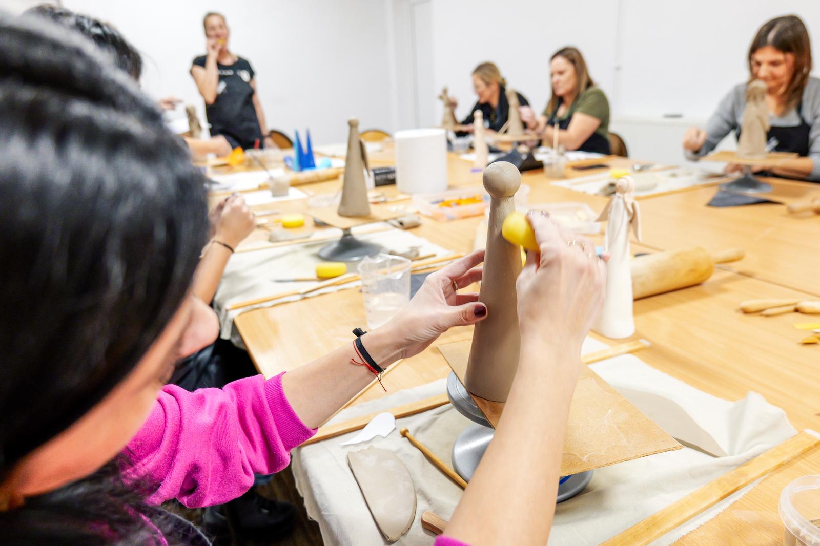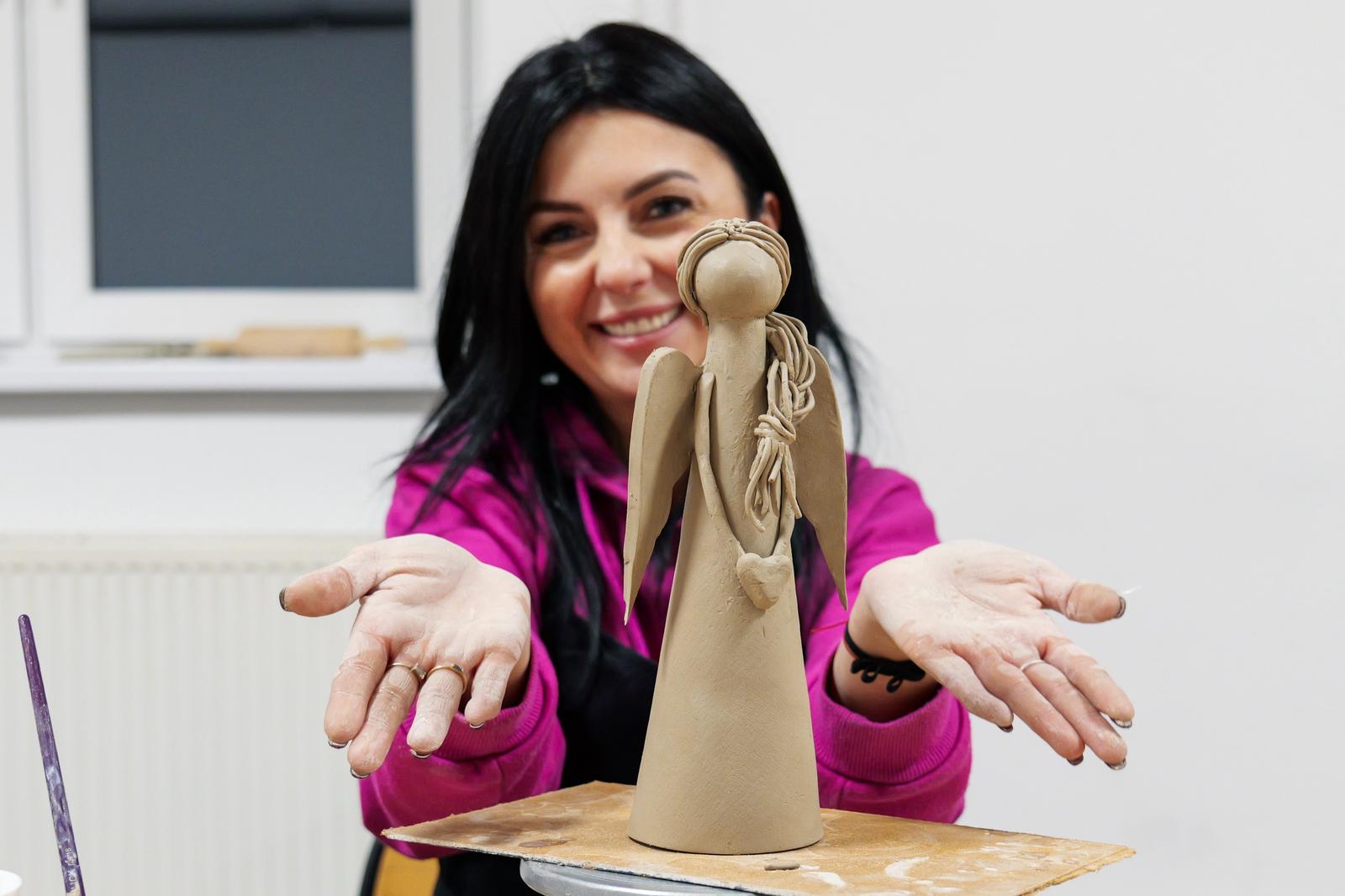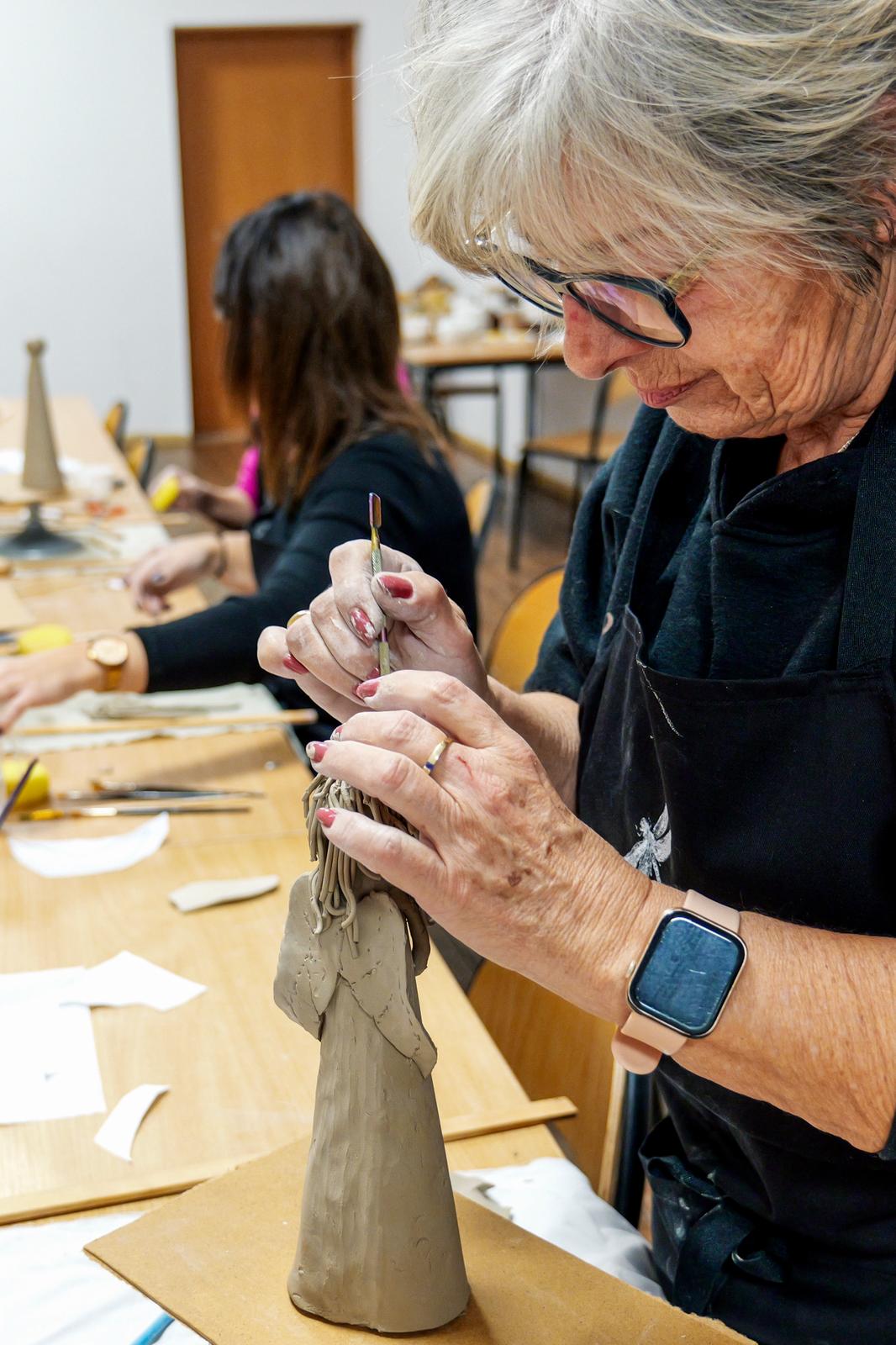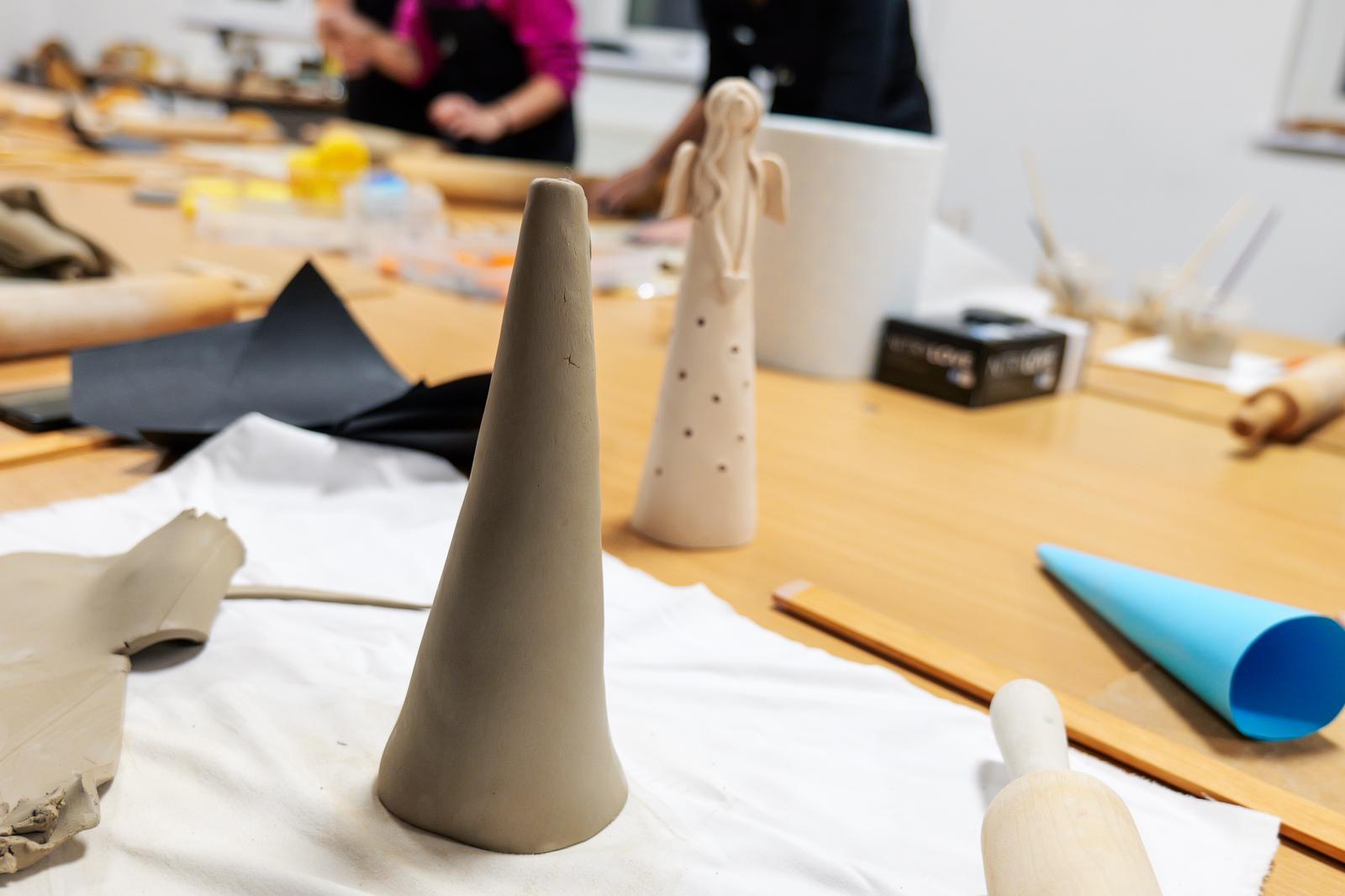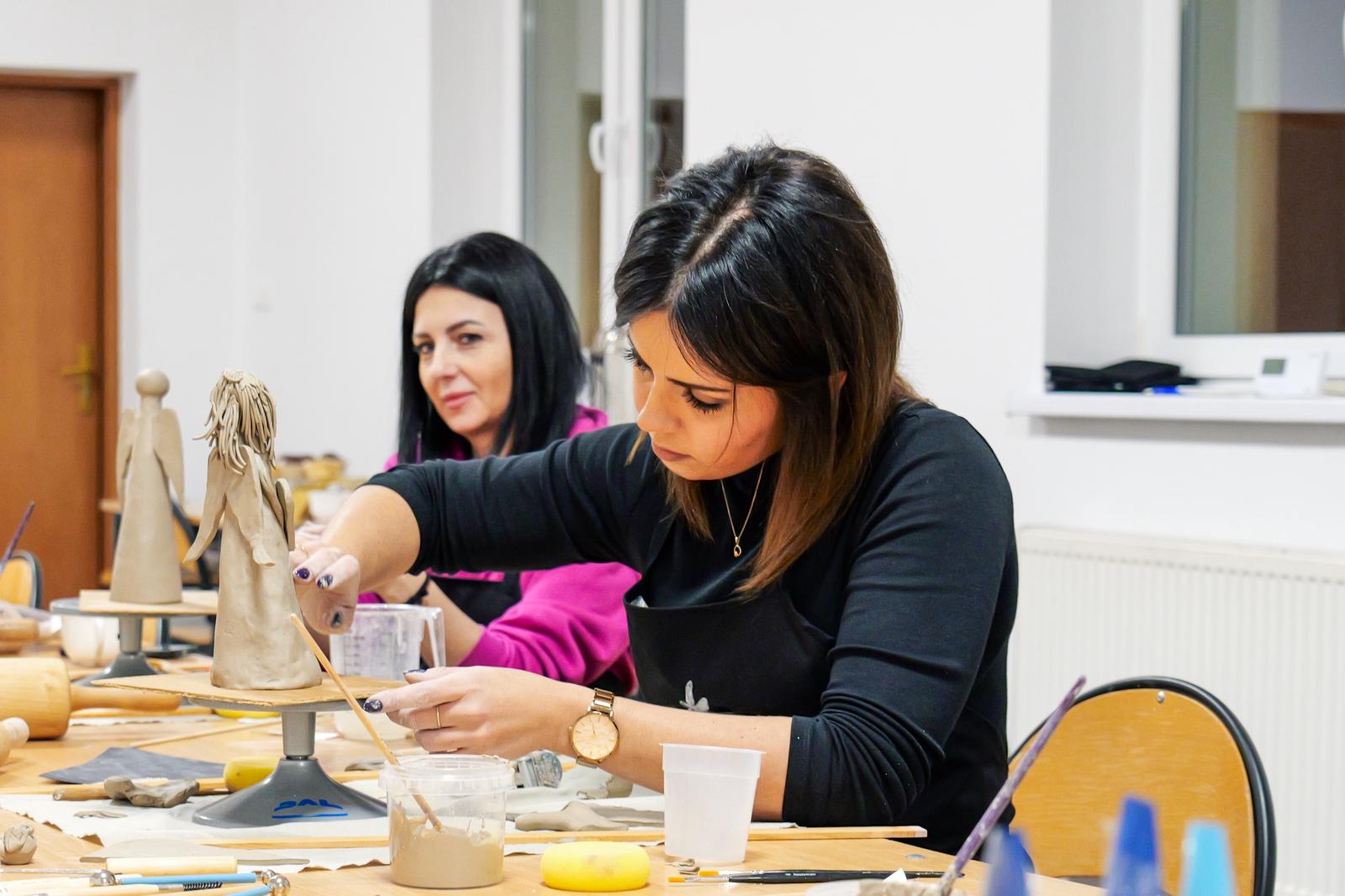 Powstały prace pełne wrażliwości i indywidualnego stylu. Jedne anielice miały klasyczne, smukłe sylwetki, inne charakteryzowały się nowoczesną formą lub bogatymi zdobieniami. Choć każda z uczestniczek otrzymała ten sam materiał, rezultaty jasno pokazały, jaką moc mają kreatywność i swoboda artystyczna. Zajęcia pokazały również, jak ważna jest przestrzeń, w której można odpocząć od codzienności i zanurzyć się w sztuce — nawet jeśli stawia się dopiero pierwsze kroki. Nadszedł na suszenia powstałych prac do wypału, niebawem spotkamy się na ich szkliwieniu.