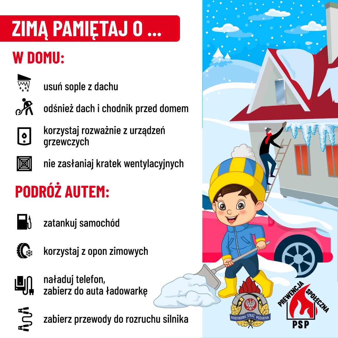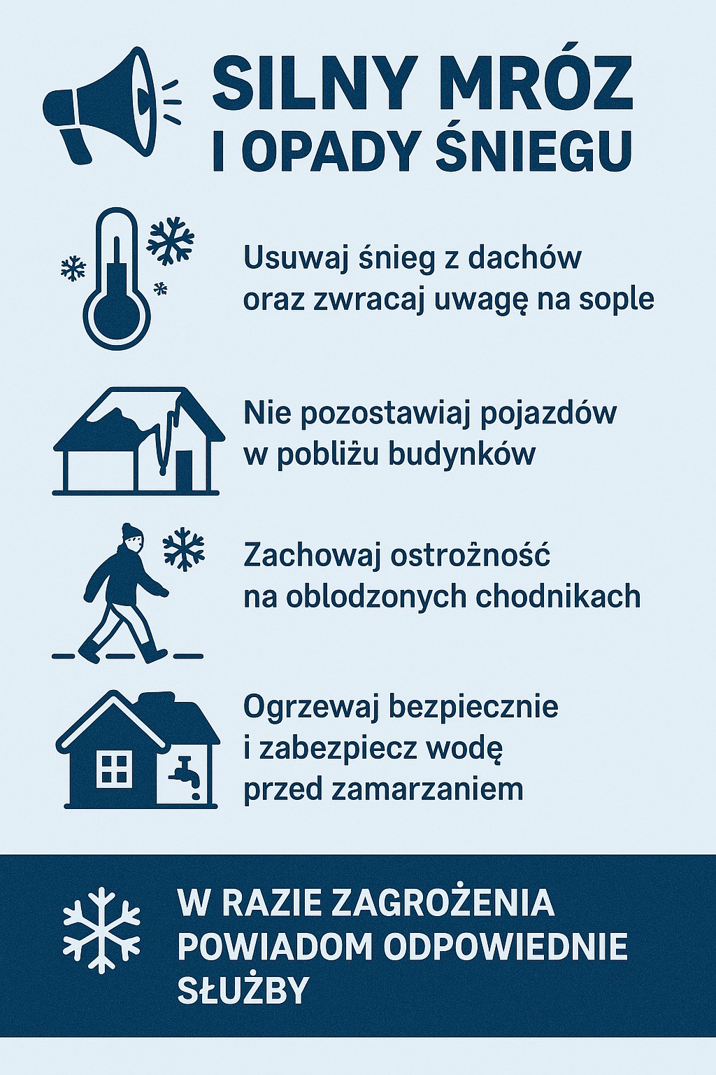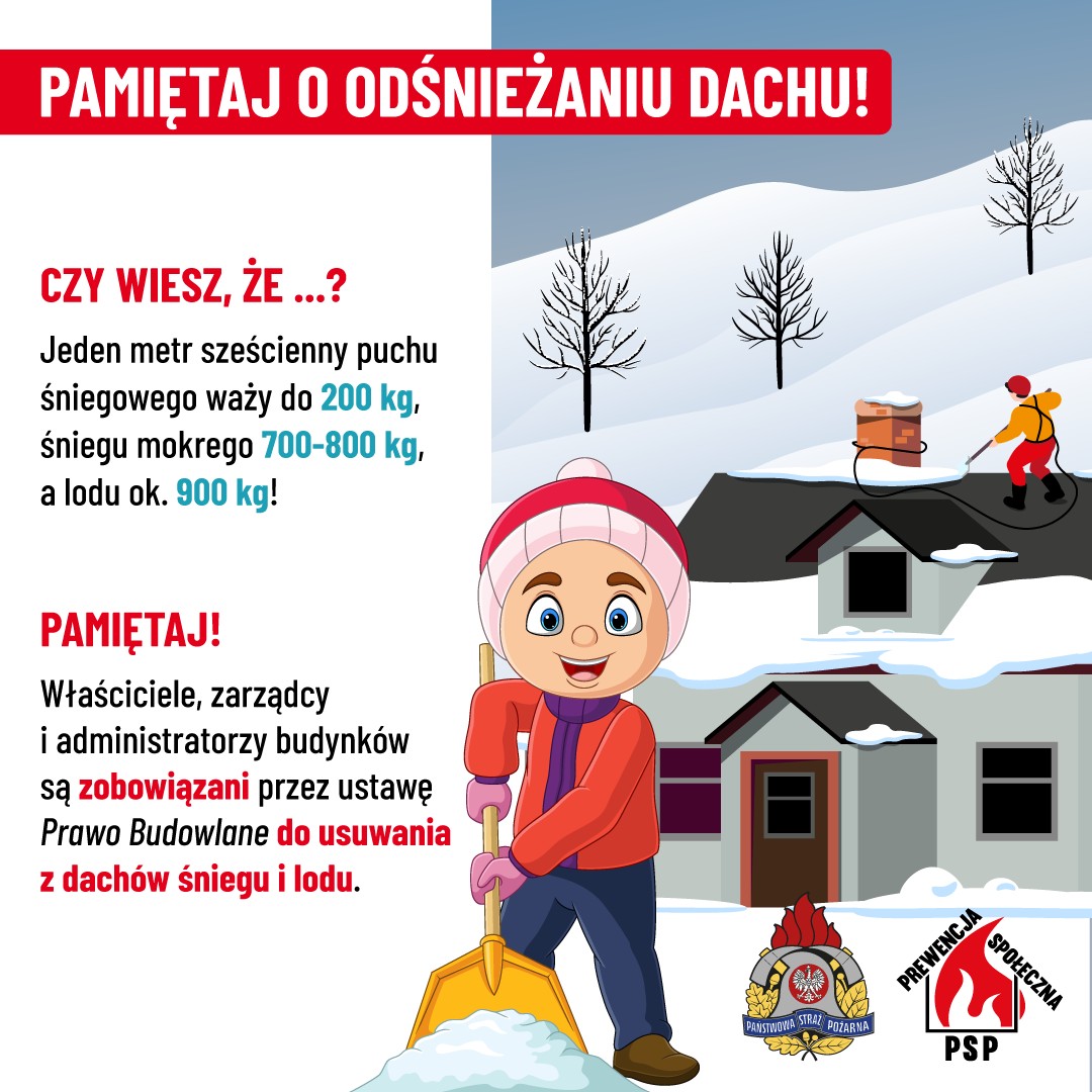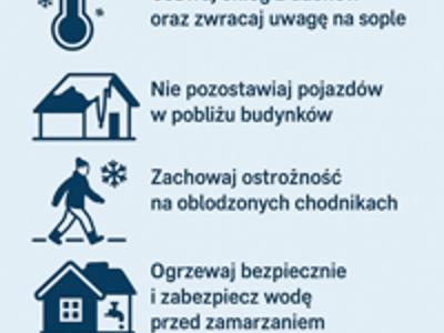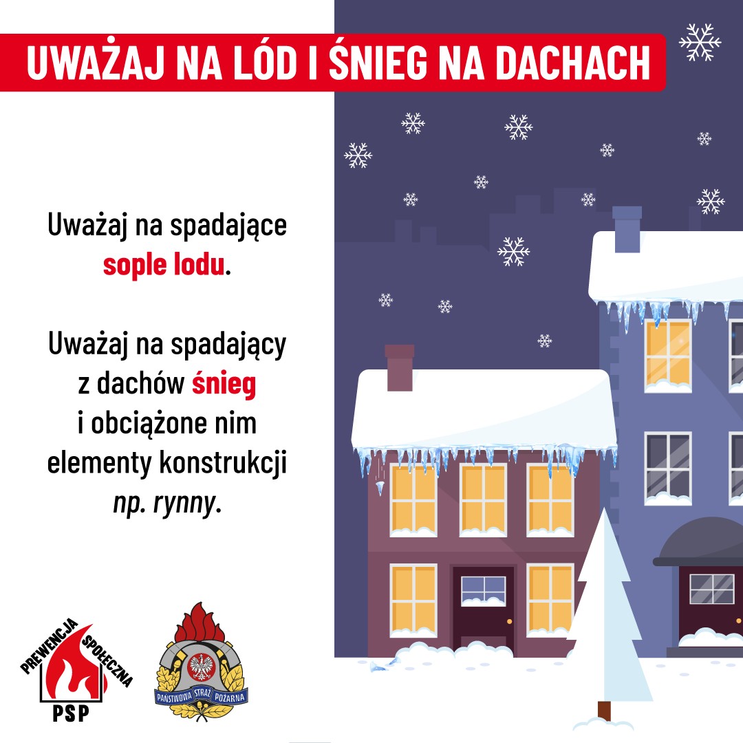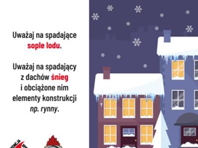W związku z prognozami zapowiadającymi w najbliższych dniach silne mrozy, opady śniegu oraz możliwość zalegania dużych ilości śniegu i tworzenia się sopli na dachach, apelujemy o zachowanie szczególnej ostrożności i podjęcie działań zapobiegawczych.