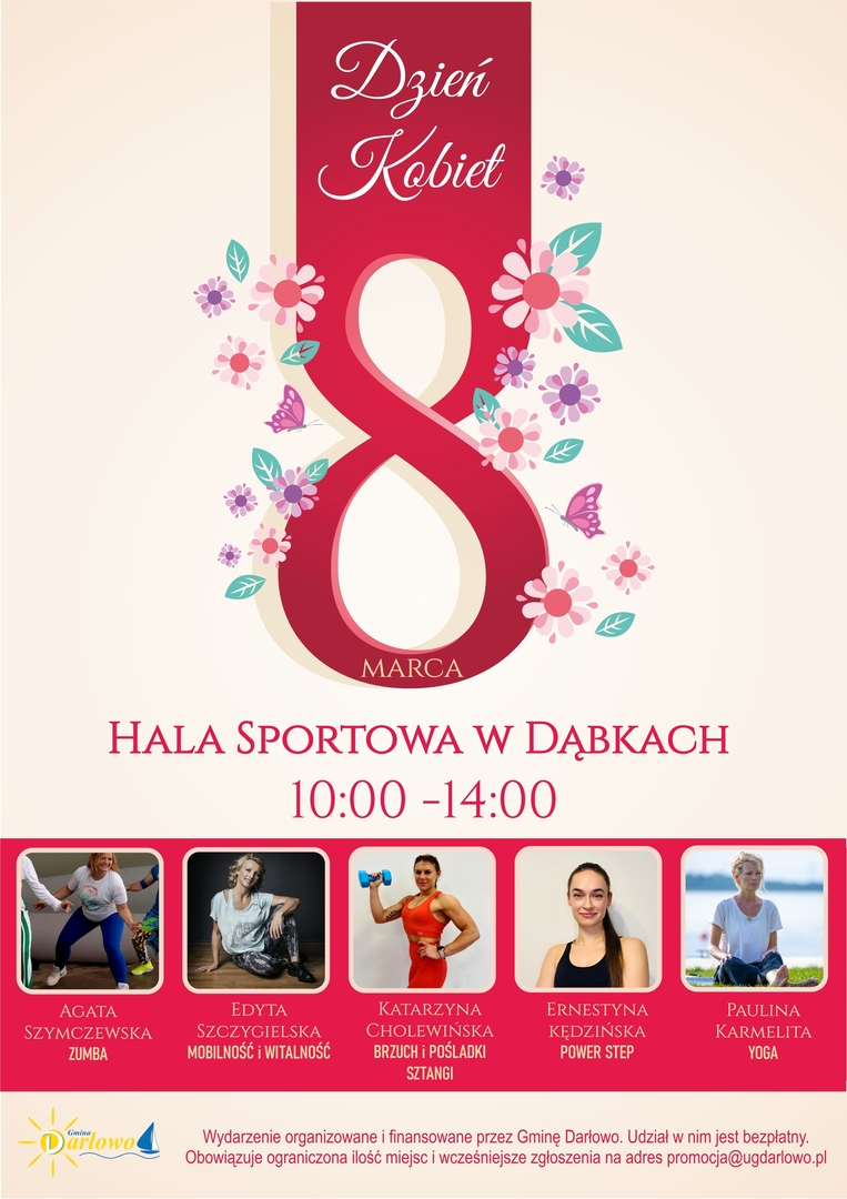 Zapraszamy wszystkie Panie z terenu gminy Darłowo na wyjątkowe wydarzenie pełne energii, ruchu i motywacji! Przygotowaliśmy dla Was dzień pełen aktywności prowadzonych przez uznane trenerki. To doskonała okazja, by zadbać o siebie, naładować baterie i spędzić czas w inspirującym towarzystwie.